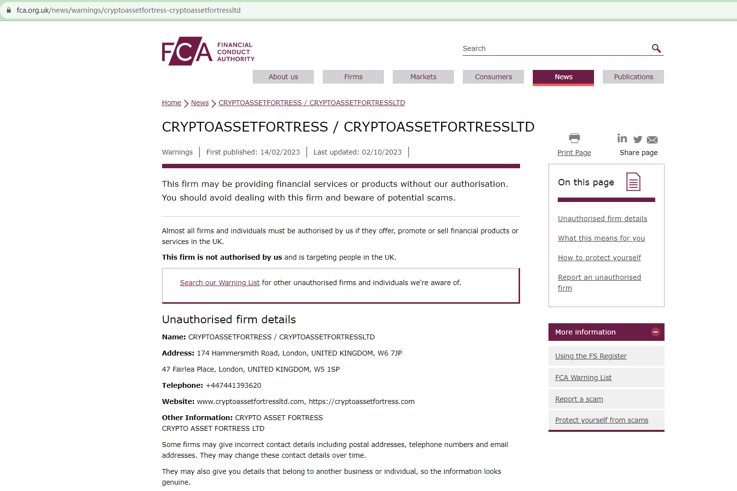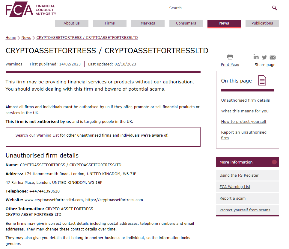 On 14 Feb 2023, the United Kingdom Financial Conduct Authority (FCA) issued a warning that CryptoAssetFortress may be providing financial services or products in the UK without authorization. You may visit: https://www.fca.org.uk/news/warnings/cryptoassetfortress