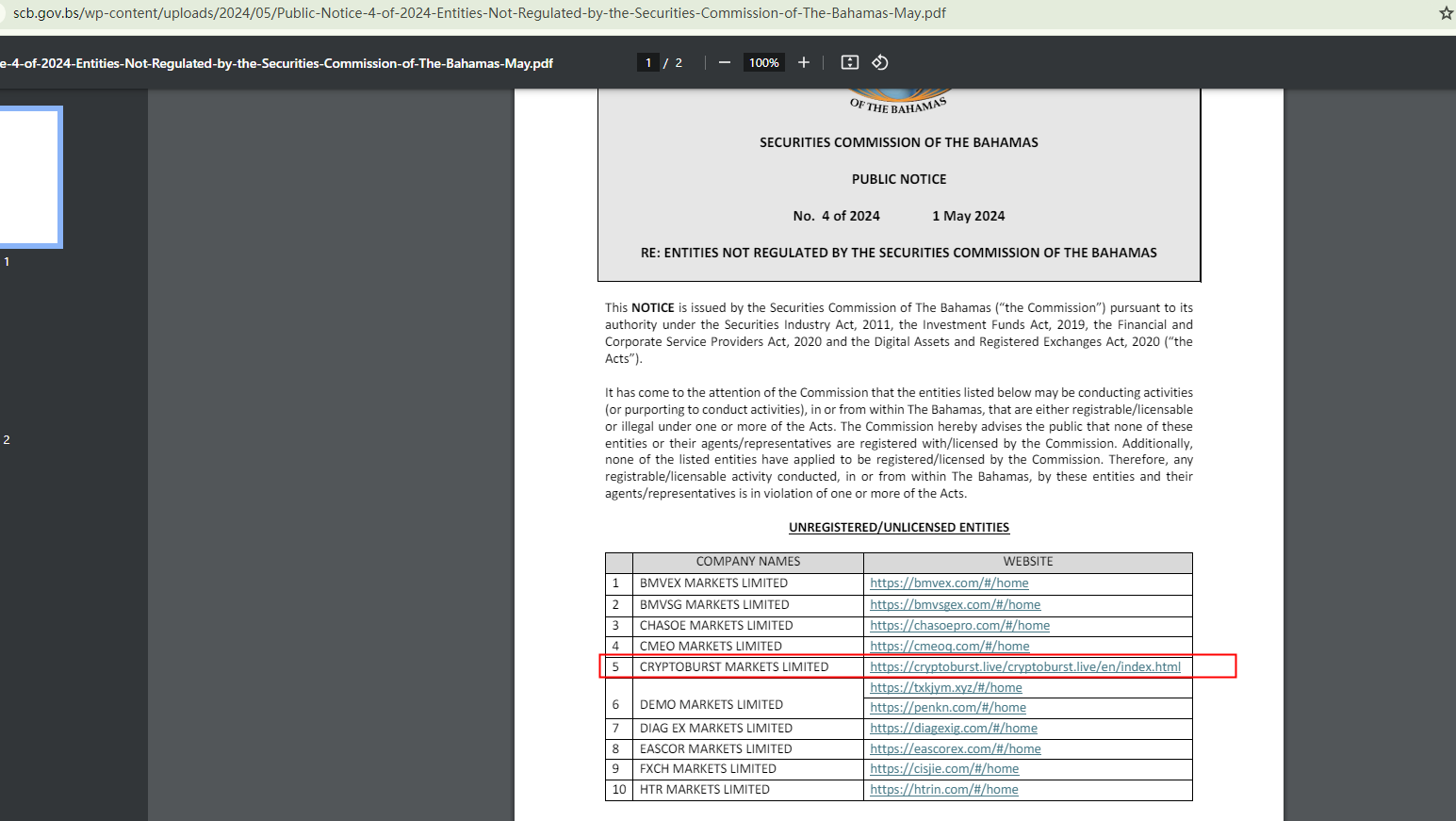 On May 1, 2024, the Securities Commission of The Bahamas (SCB) added Cryptoburst to warning list for offering financial services or products without their permission. https://www.scb.gov.bs/wp-content/uploads/2024/05/Public-Notice-4-of-2024-Entities-Not-Regulated-by-the-Securities-Commission-of-The-Bahamas-May.pdf