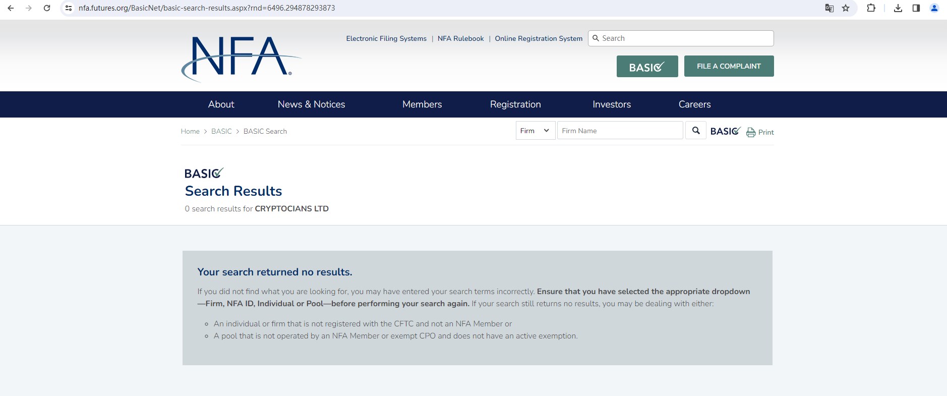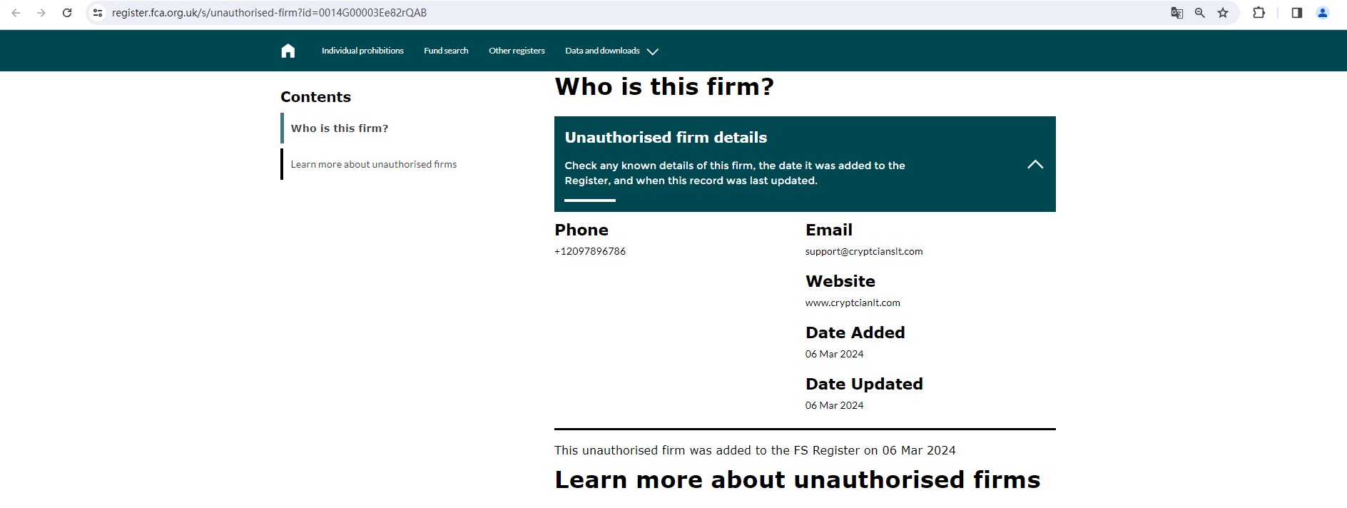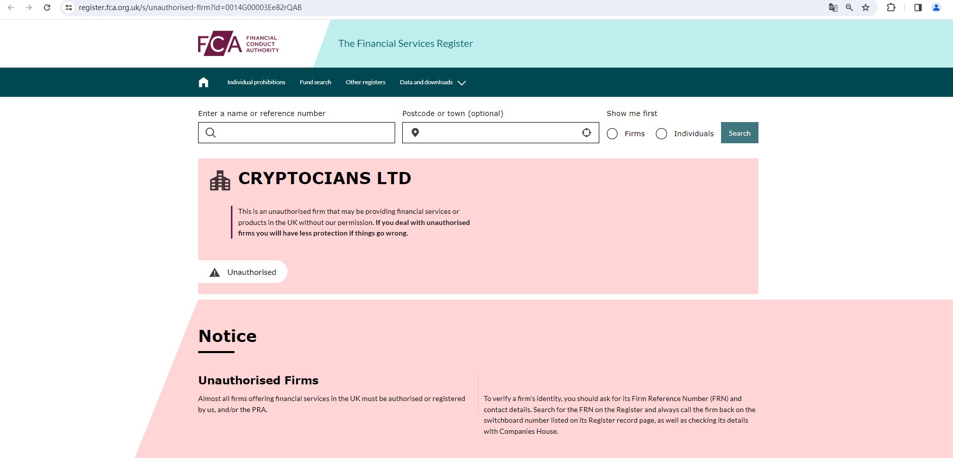 But we didn't find any results in the National Futures Association(NFA) in the US. This firm is also not authorised by the Financial Conduct Authority (FCA) in the UK. And the FCA issued a warning that CRYPTOCIANS LTD was providing financial services or products in the UK without authorisation.