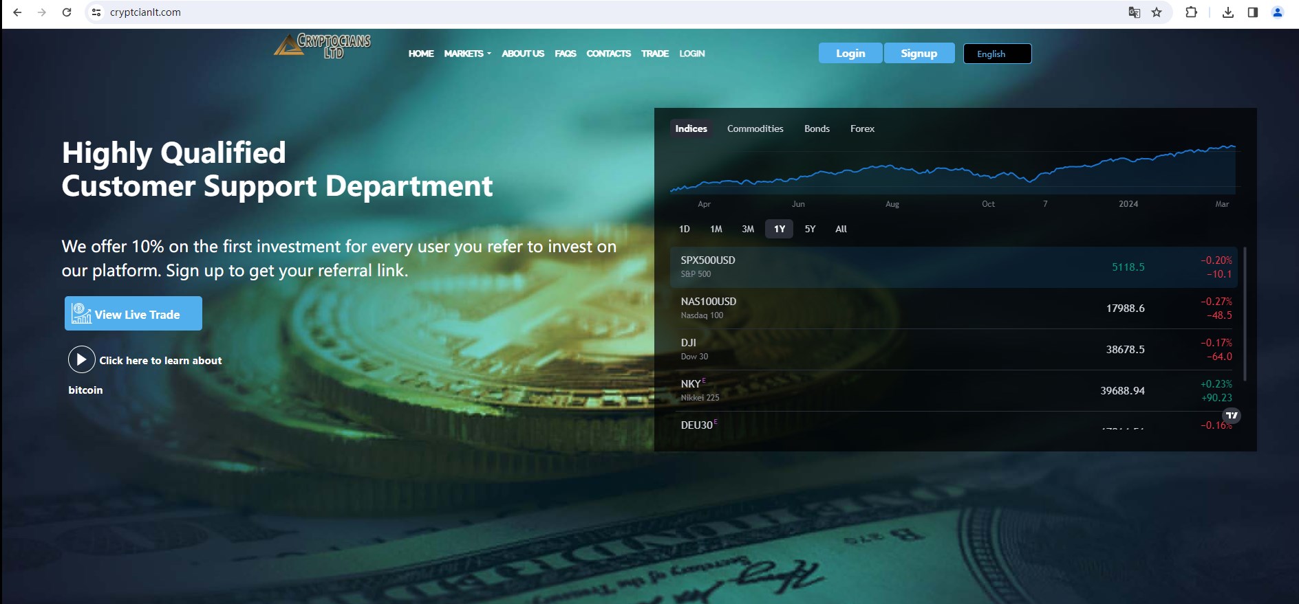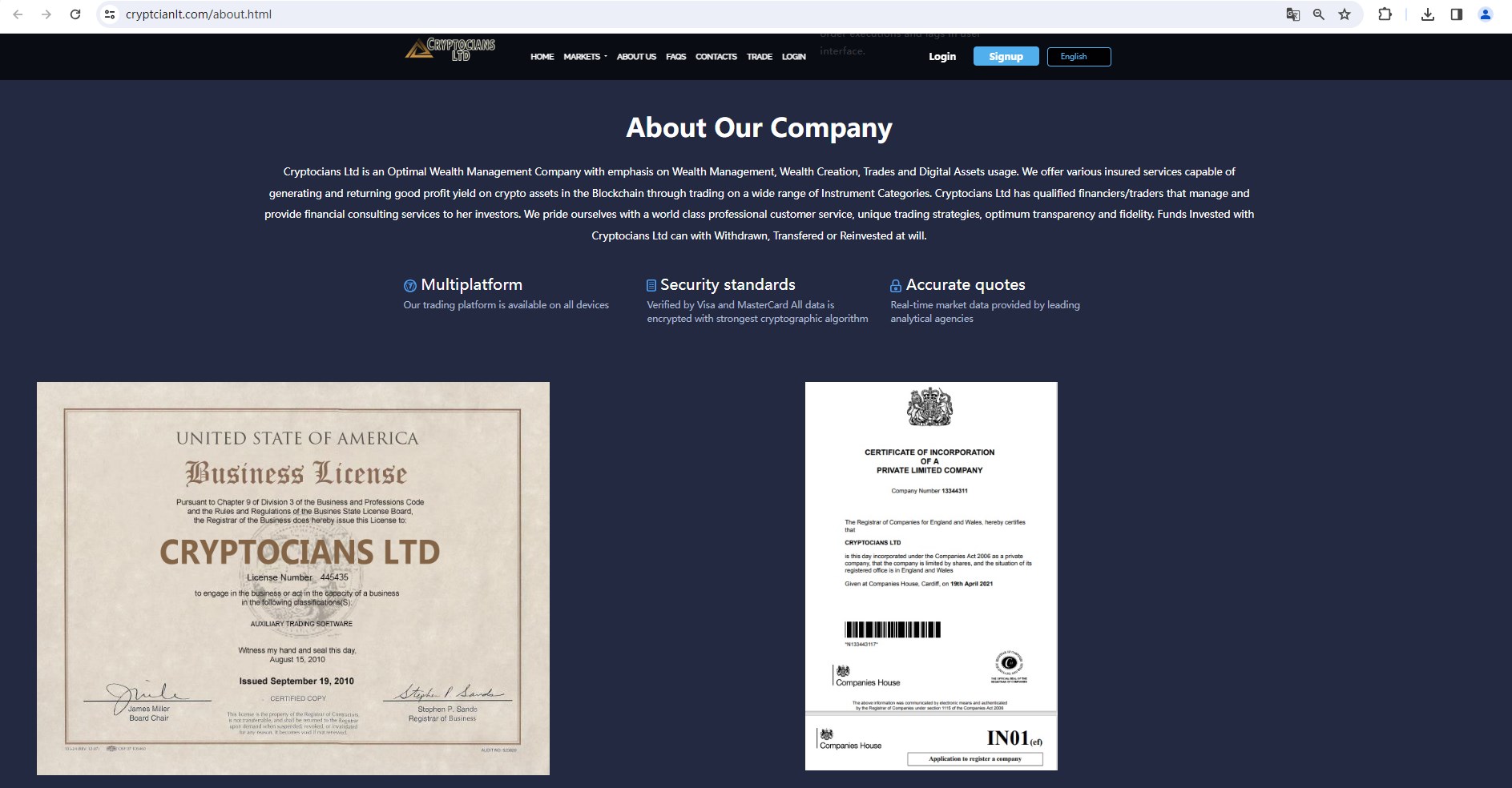 Cryptocians Ltd claims to be registered with The United States and the United Kingdom, Offering a range of financial services, including indices, commodities, bonds, forex and more instruments in global markets.