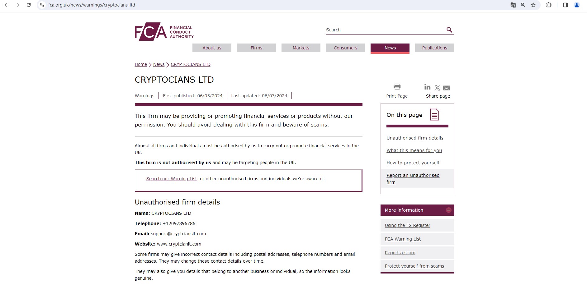 On 6 March 2024, the United Kingdom Financial Conduct Authority (FCA) issued a warning against CRYPTOCIANS LTD, believing this company might be providing financial services or products without authorisation in the UK. You may visit: https://www.fca.org.uk/news/warnings/cryptocians-ltd.