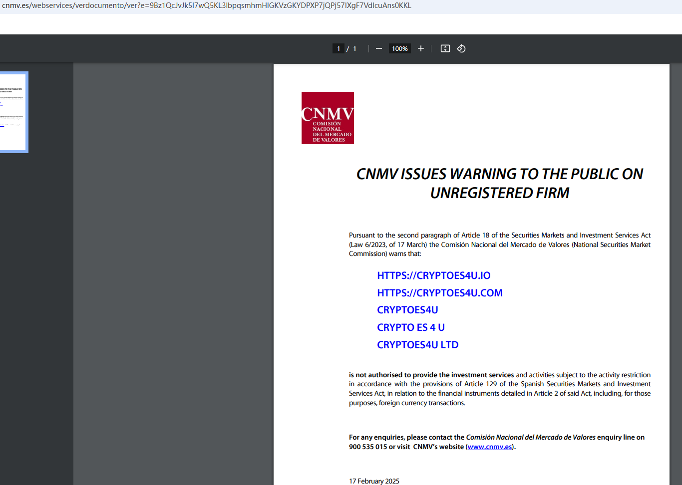On February 17 2025, the National Securities Market Commission (CNMV) issued a warning against CRYPTOES4U(aka CRYPTO ES 4 U aka CRYPTOES4U LTD), believing this company might be providing financial services or products without proper authorization. https://www.cnmv.es/webservices/verdocumento/ver?e=9Bz1QcJvJk5I7wQ5KL3lbpqsmhmHlGKVzGKYDPXP7jQPj57IXgF7VdIcuAns0KKL