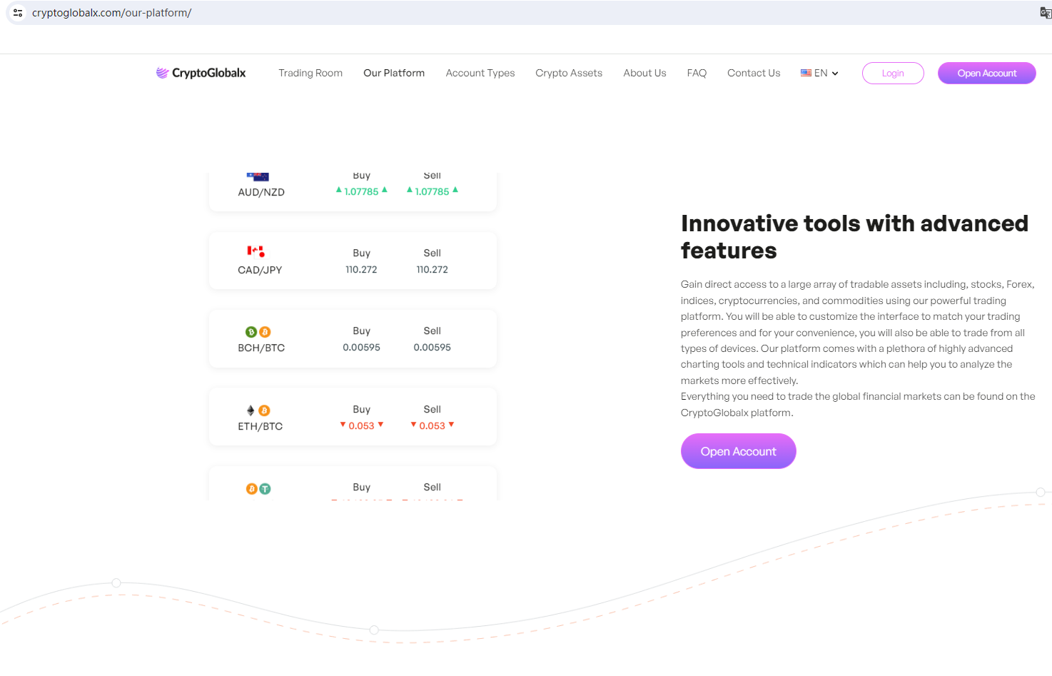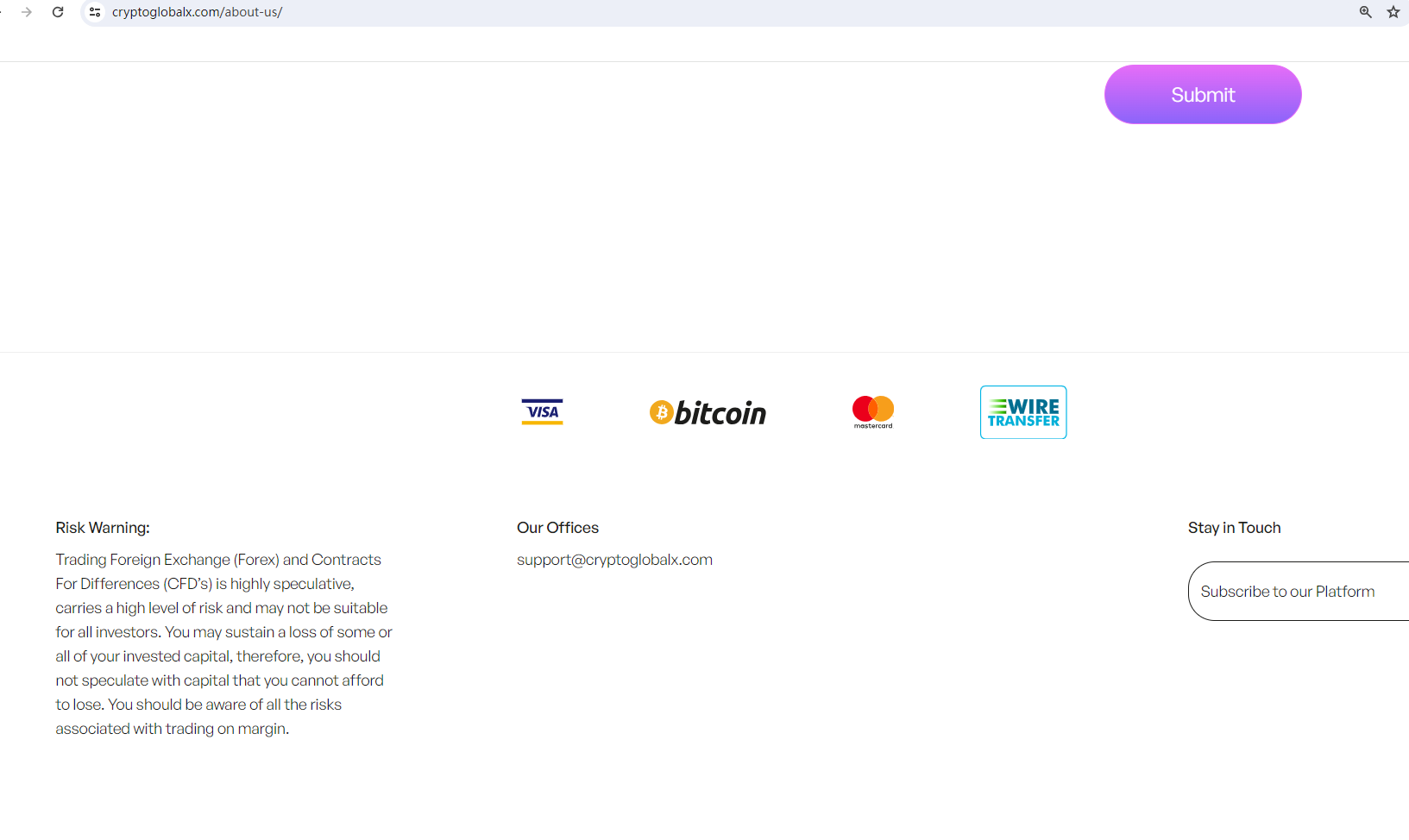 CryptoGlobalx claims to be a reliable company without presenting any information about its regulation or contact. The lack of such important information may be a distinct signal of an unlicensed broker, as regulated companies always present their accreditations and licenses in a prominent position. It is a red flag.