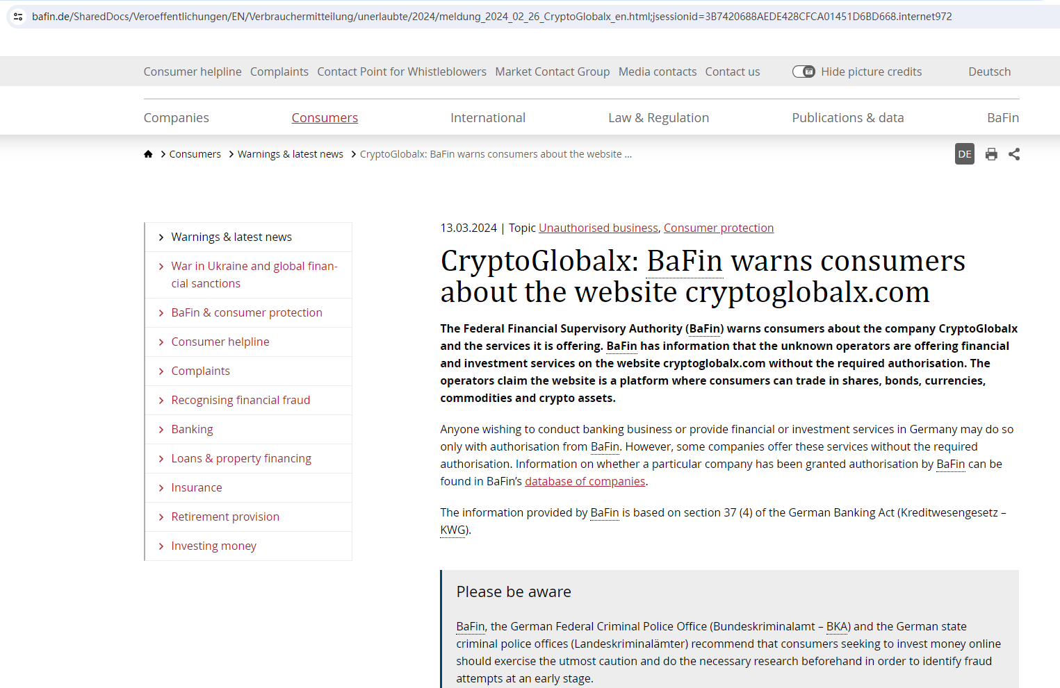 On 13 March 2024, the Federal Financial Supervisory Authority (BaFin) issued a warning that CryptoGlobalx was providing financial services or products without authorisation. You may visit: https://www.bafin.de/SharedDocs/Veroeffentlichungen/EN/Verbrauchermitteilung/unerlaubte/2024/meldung_2024_02_26_CryptoGlobalx_en.html;jsessionid=3B7420688AEDE428CFCA01451D6BD668.internet972
