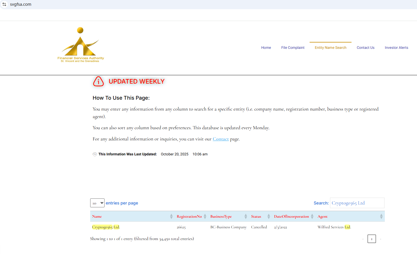 BrokersView found that the domain "https://cryptogo365.com/" is currently inaccessible. Cryptogo365 Ltd previously claimed to be registered with the St. Vincent and the Grenadines Financial Services Authority (SVG FSA), a search reveals its registration as "canceled." Entrusting investor funds to this company is extremely risky due to the lack of legal safeguards. Cryptogo365 Ltd is a scam.
