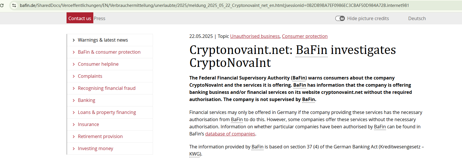 On May 22, 2025, the Federal Financial Supervisory Authority (BaFin) issued a warning against CryptoNovaInt for the lack of the required authorization. https://www.bafin.de/SharedDocs/Veroeffentlichungen/EN/Verbrauchermitteilung/unerlaubte/2025/meldung_2025_05_22_Cryptonovaint_net_en.html;jsessionid=0B2DB9BA7EF0986EC3CBAF50D984A72B.internet981
