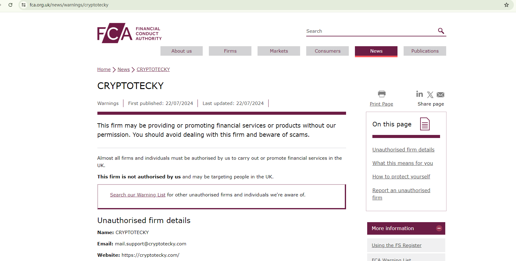 On July 22, 2024, the Financial Conduct Authority (FCA) issued a warning against CRYPTOTECKY, believing this company might be providing financial services or products without proper authorization in the UK. https://www.fca.org.uk/news/warnings/cryptotecky