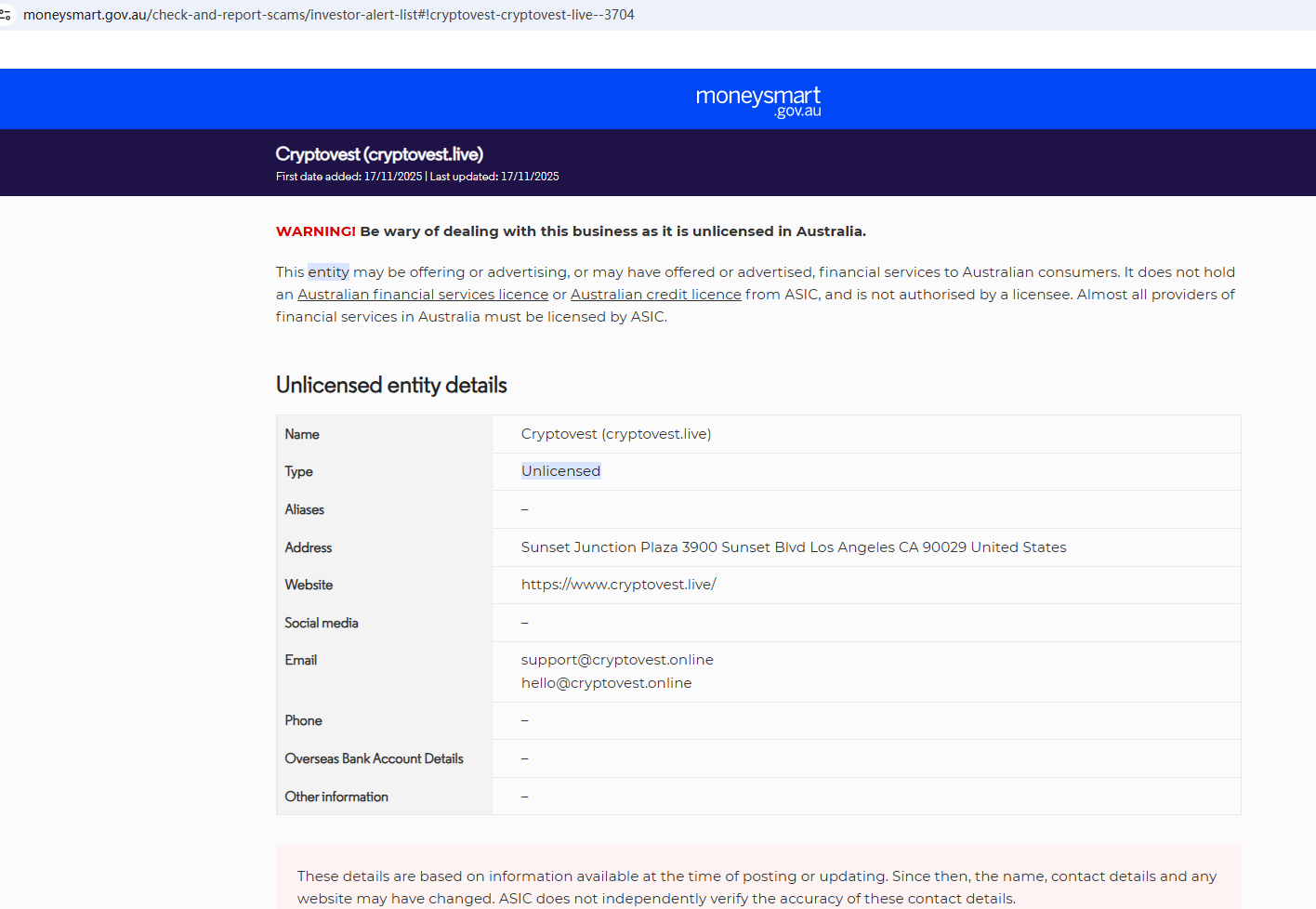On Nov 17, 2025, the Australian Securities & Investments Commission (ASIC) issued a warning against Cryptovest, believing this company might be providing financial services or products without proper authorization. https://moneysmart.gov.au/check-and-report-scams/investor-alert-list#!cryptovest-cryptovest-live--3704