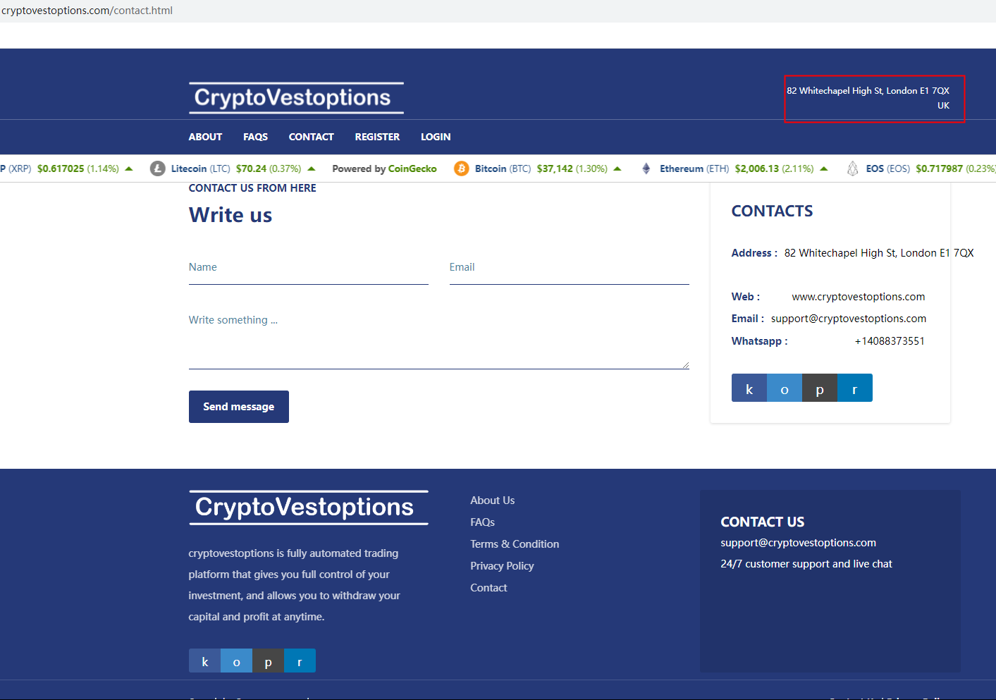 According to its website, CRYPTOVESTOPTIONS is located in the UK, but upon investigation, we found that the United Kingdom Financial Conduct Authority (UK FCA) issued a warning that CRYPTOVESTOPTIONS was providing financial services or products without authorisation.