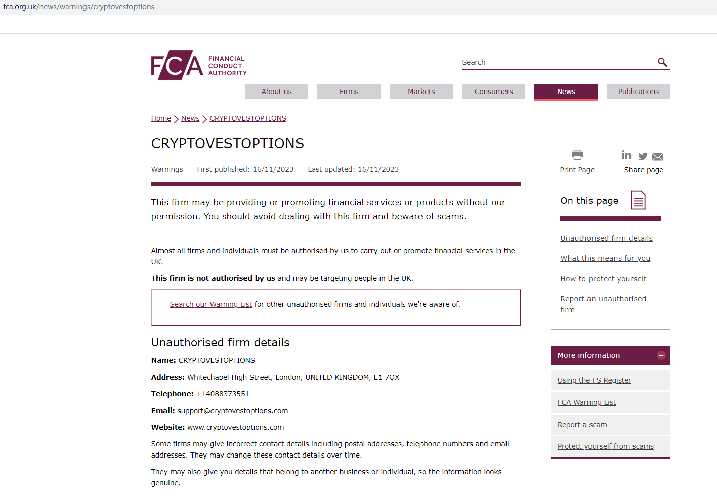 On 16 November 2023, the United Kingdom Financial Conduct Authority (UK FCA) issued a warning that CRYPTOVESTOPTIONS was providing financial services or products in the UK without authorisation. You may visit: https://www.fca.org.uk/news/warnings/cryptovestoptions