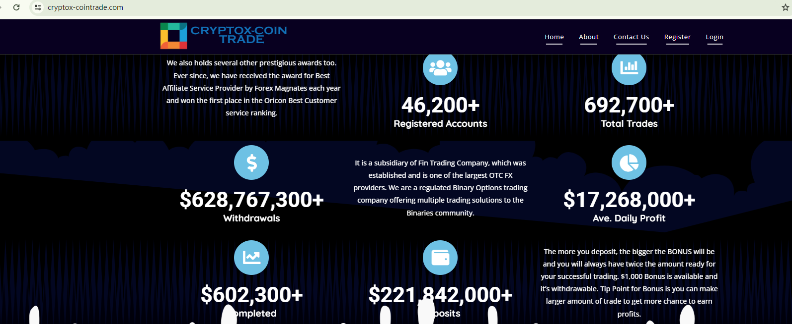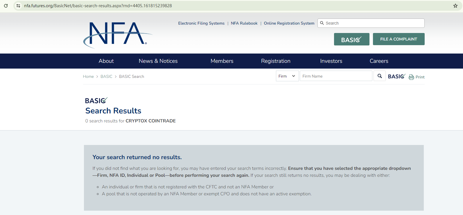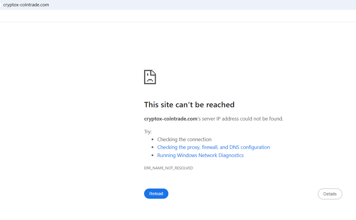 BrokersView found that the domain "https://cryptox-cointrade.com/" is currently inaccessible. This is widely regarded as a significant red flag, as the suspension of a broker's website often points to underlying regulatory or operational issues.
