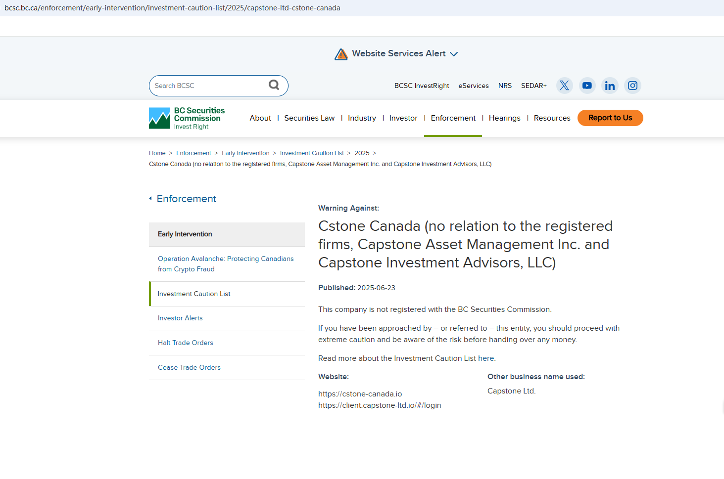 On June 23, 2025, the British Columbia Securities Commission (BCSC) issued a warning against Cstone Canada, stating that this broker is not registered to trade in, or advise on, securities or derivatives in BC. https://www.bcsc.bc.ca/enforcement/early-intervention/investment-caution-list/2025/capstone-ltd-cstone-canada