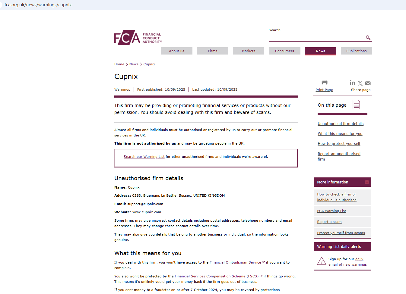 On Sept 10, 2025, the Financial Conduct Authority (FCA) issued a warning against Cupnix, believing this company might be providing financial services or products without proper authorization. https://www.fca.org.uk/news/warnings/cupnix