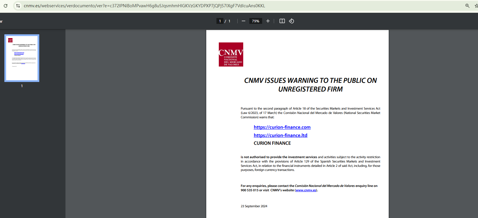 On September 23, 2024, the Comisión Nacional del Mercado de Valores (CNMV) added Curion Finance to its warning list for providing investment services without authorization. https://www.cnmv.es/portal/ResultadoBusqueda.aspx?tipo=1&nombre=curion