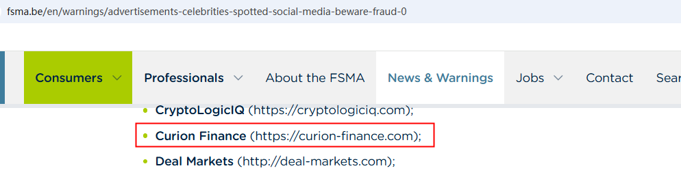 On March 19, 2025, the Financial Services and Markets Authority (FSMA) issued a warning about Curion Finance for the lack of the required authorization. https://www.fsma.be/en/warnings/advertisements-celebrities-spotted-social-media-beware-fraud-0