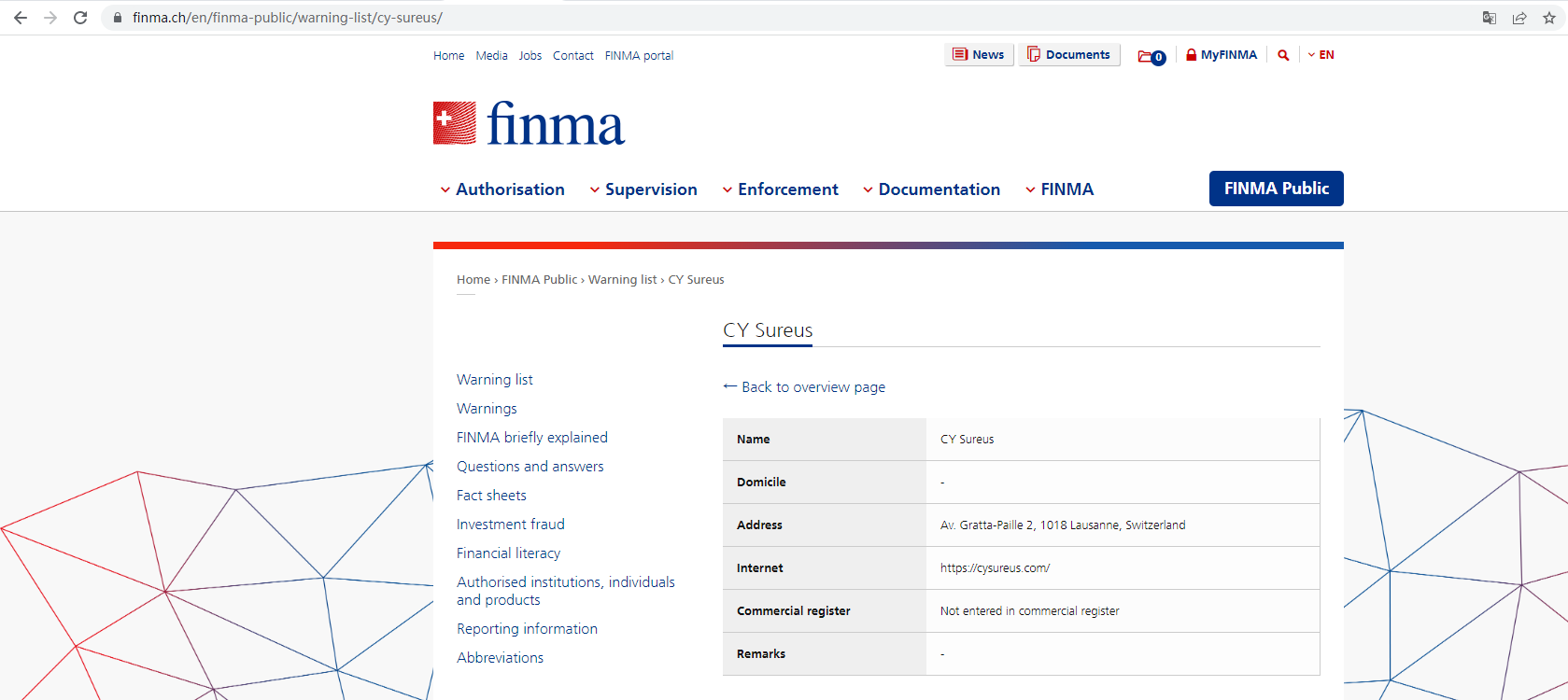 The Swiss Financial Market Supervisory Authority (FINMA) issued a warning that CY Sureus was providing finacial services or products without authorisation.