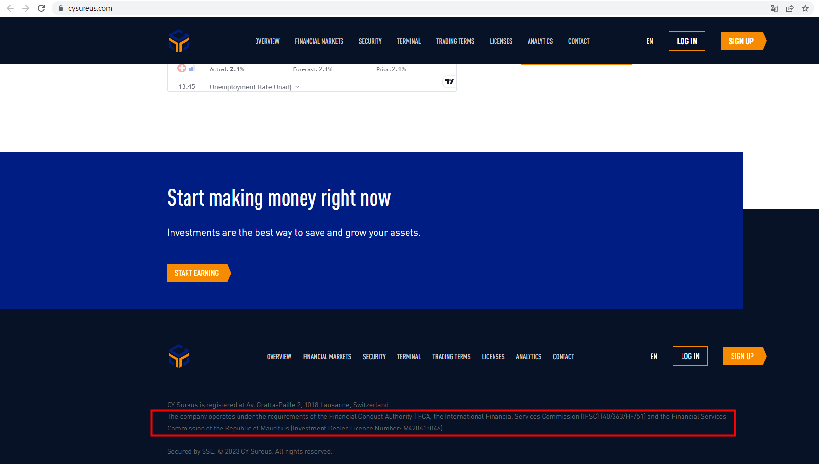 CY Sureus claims to be regulated by Financial Conduct Authority (FCA), Belize Financial Services Commission (FSC) and The Financial Services Commission, Mauritius (FSC). But we don't find the authorised company information on these regulatory institutions matching to CY Sureus. It is a red flag.
