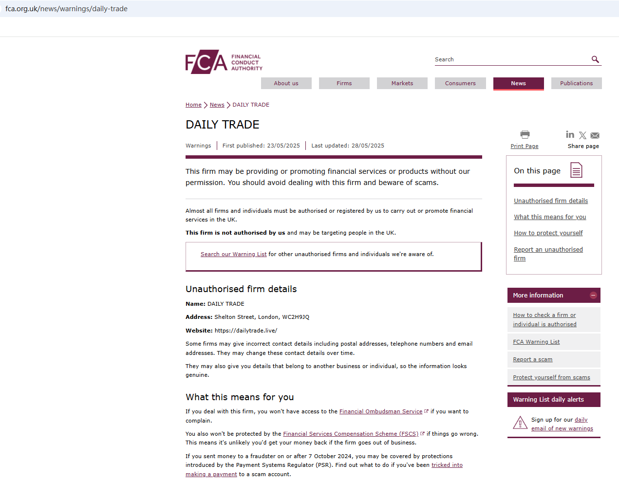 On May 28, 2025, the Financial Conduct Authority (FCA) issued a warning against DAILY TRADE, believing this company might be providing financial services or products without proper authorization in the UK. https://www.fca.org.uk/news/warnings/daily-trade