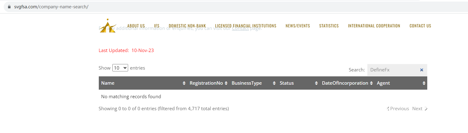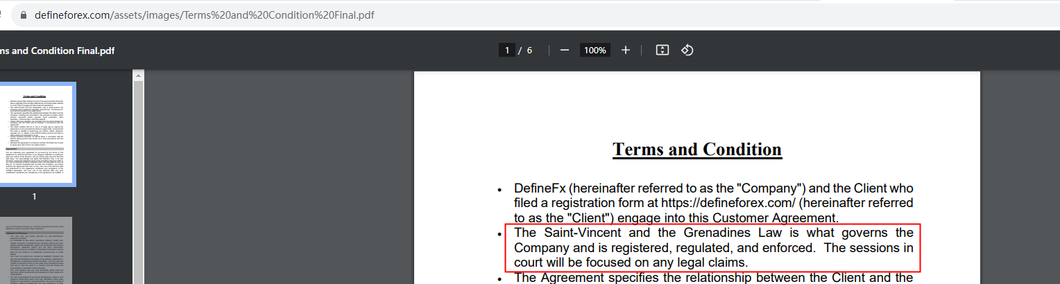 DefineFx claims to be registered in Financial Services Authority (FSA) of Saint Vincent and the Grenadines, but we don't find any results on FSA of Saint Vincent and the Grenadines matching to DefineFx. What's more, FSA of Saint Vincent and the Grenadines doesn't regulate forex and it is not a regulatory institution. The truth is that DefineFx is not under valid regulation by any regulators to do forex. Investors' funds in this broker are unsafe and cannot be protected by any law.