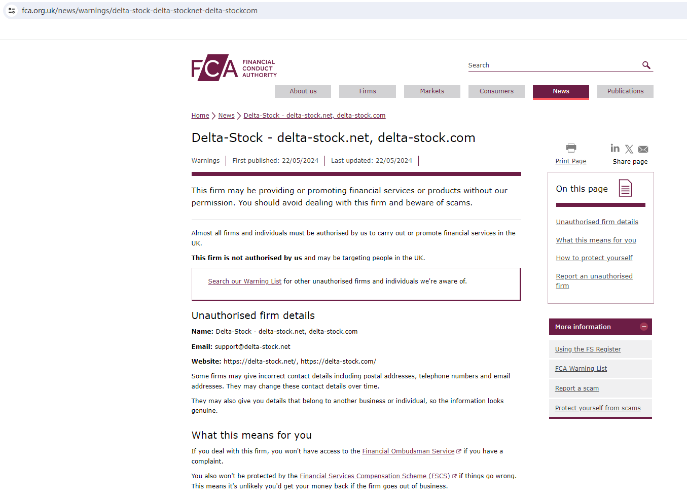 On 22 May 2024, the United Kingdom Financial Conduct Authority (UK FCA) issued a warning that delta stock.net was providing financial services or products in the UK without authorisation. You may visit: https://www.fca.org.uk/news/warnings/delta-stock-delta-stocknet-delta-stockcom