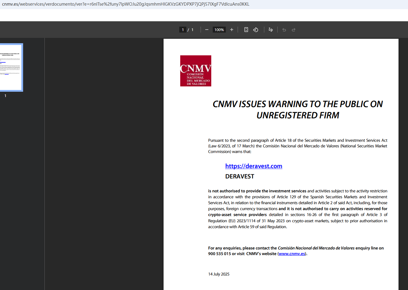 In addition, the National Securities Market Commission (CNMV) issued a warning against Deravest, believing this company might be providing financial services or products without proper authorization.