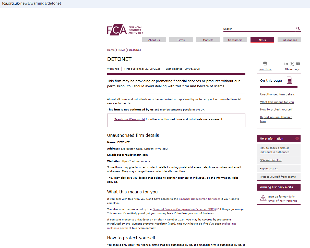 On May 29, 2025, the Financial Conduct Authority (FCA) issued a warning against DETONET, believing this company might be providing financial services or products without proper authorization in the UK. https://www.fca.org.uk/news/warnings/detonet