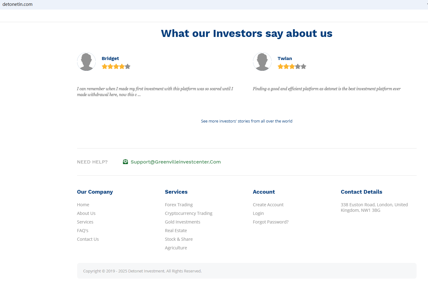 According to its website, it is located in the UK. Upon investigation, we found that the Financial Conduct Authority (FCA) issued a warning against DETONET, believing this company might be providing financial services or products without proper authorization in the UK.