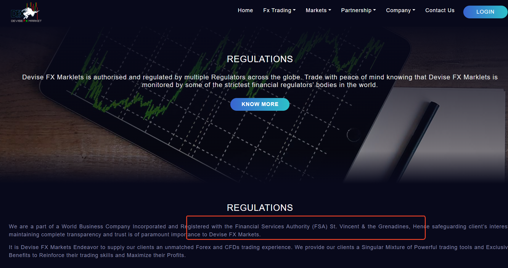 Devise Fx Markets claims to be a regulated entity under the Financial Services Authority (FSA) of Saint Vincent and the Grenadines. However, our investigation reveals that a search of the official registry maintained by the SVG FSA does not return any record of Devise Fx Markets or any associated entity. Moreover, the Saint Vincent and the Grenadines FSA does not regulate forex trading.