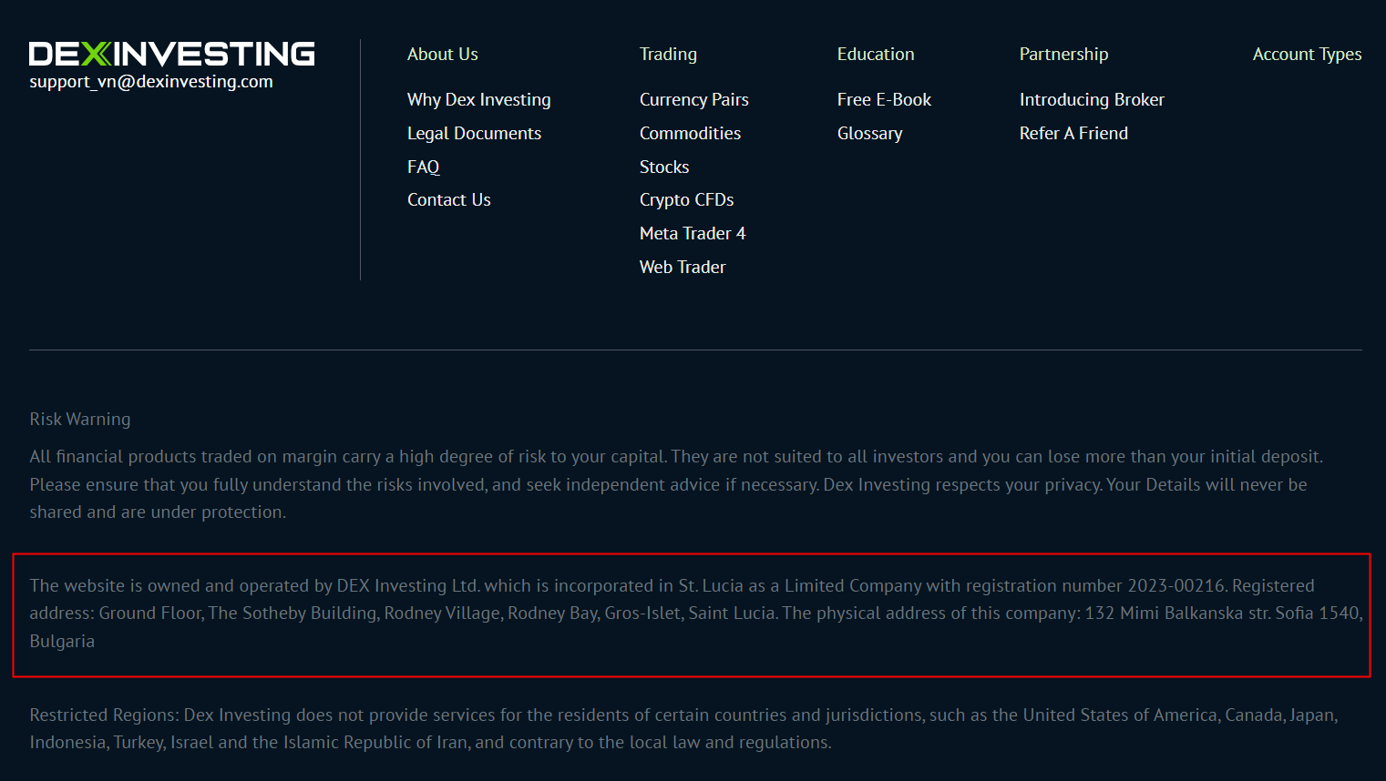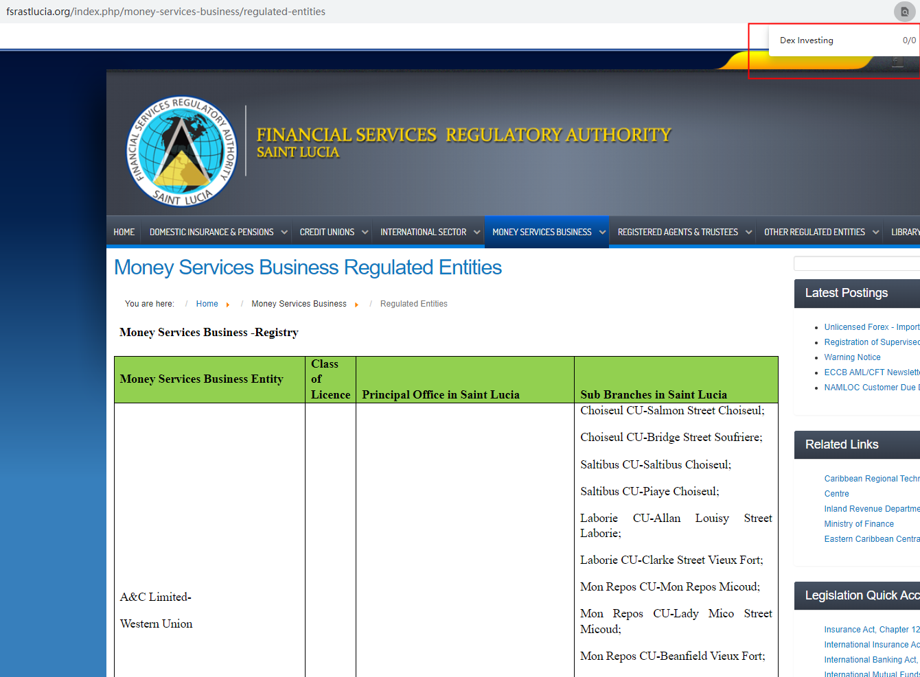 According to its website, Dex Investing is claiming to be a part of DEX Investing Ltd, a company incorporated in Saint Lucia that offers investment and trading services in various financial derivatives including foreign exchange, commodities, stocks, and cryptocurrencies. However, upon conducting an investigation, it was found that there is no matching information available in the Financial Services Regulatory Authority (FSRA).