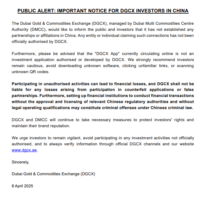 On April 8, 2025, the Dubai-based DGCX officially announced that it has not established any partnerships or authorized applications in China. It further warned that any claims of affiliation—particularly those circulating online regarding the "DGCX APP"—are false and misleading.
