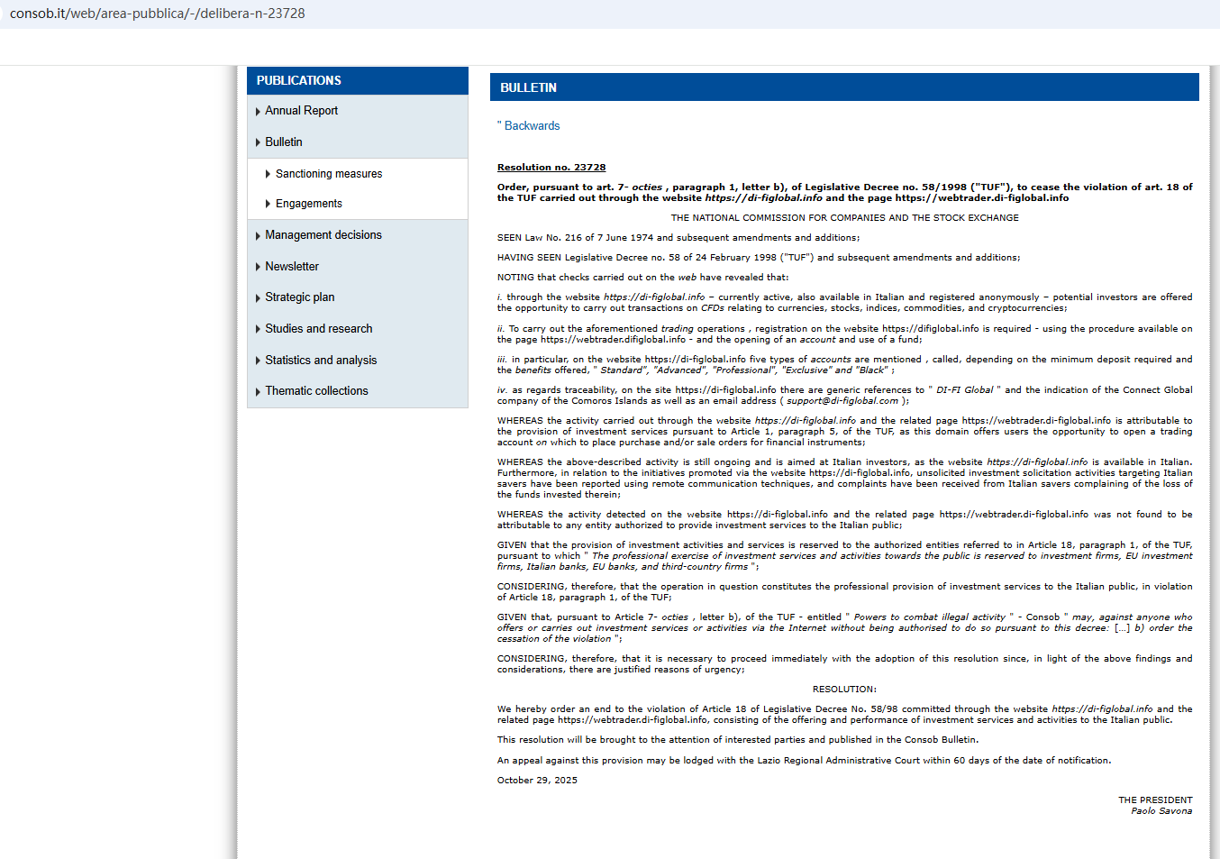On Oct 29, 2025, the Italian Companies and Exchange Commission (CONSOB) ordered Di Fi Global to be blacked out since it offers financial services illegally in Italy. https://www.consob.it/web/area-pubblica/-/delibera-n-23728