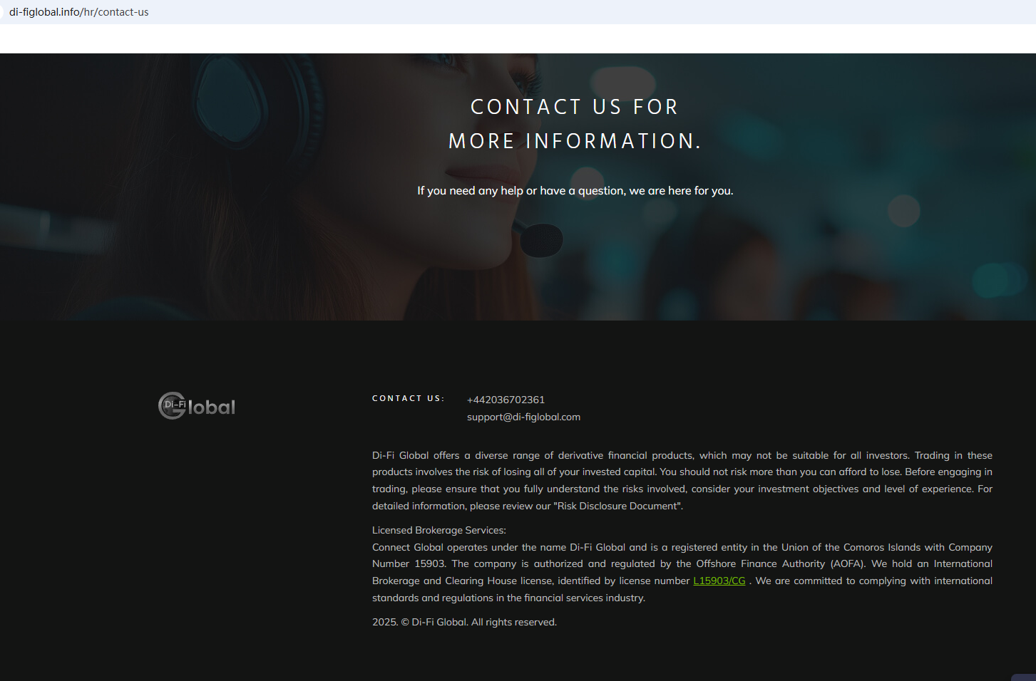Di Fi Global claims on its website to be regulated by the Anjouan Offshore Finance Authority (AOFA), but our investigation revealed that it has no registered website with the AOFA, making further verification impossible for investors. More importantly, this regulatory body is offshore, with unclear regulations and questionable regulatory effectiveness. Furthermore, the Italian Companies and Exchange Commission (CONSOB) ordered Di Fi Global to be blacked out since it offers financial services illegally in Italy.
