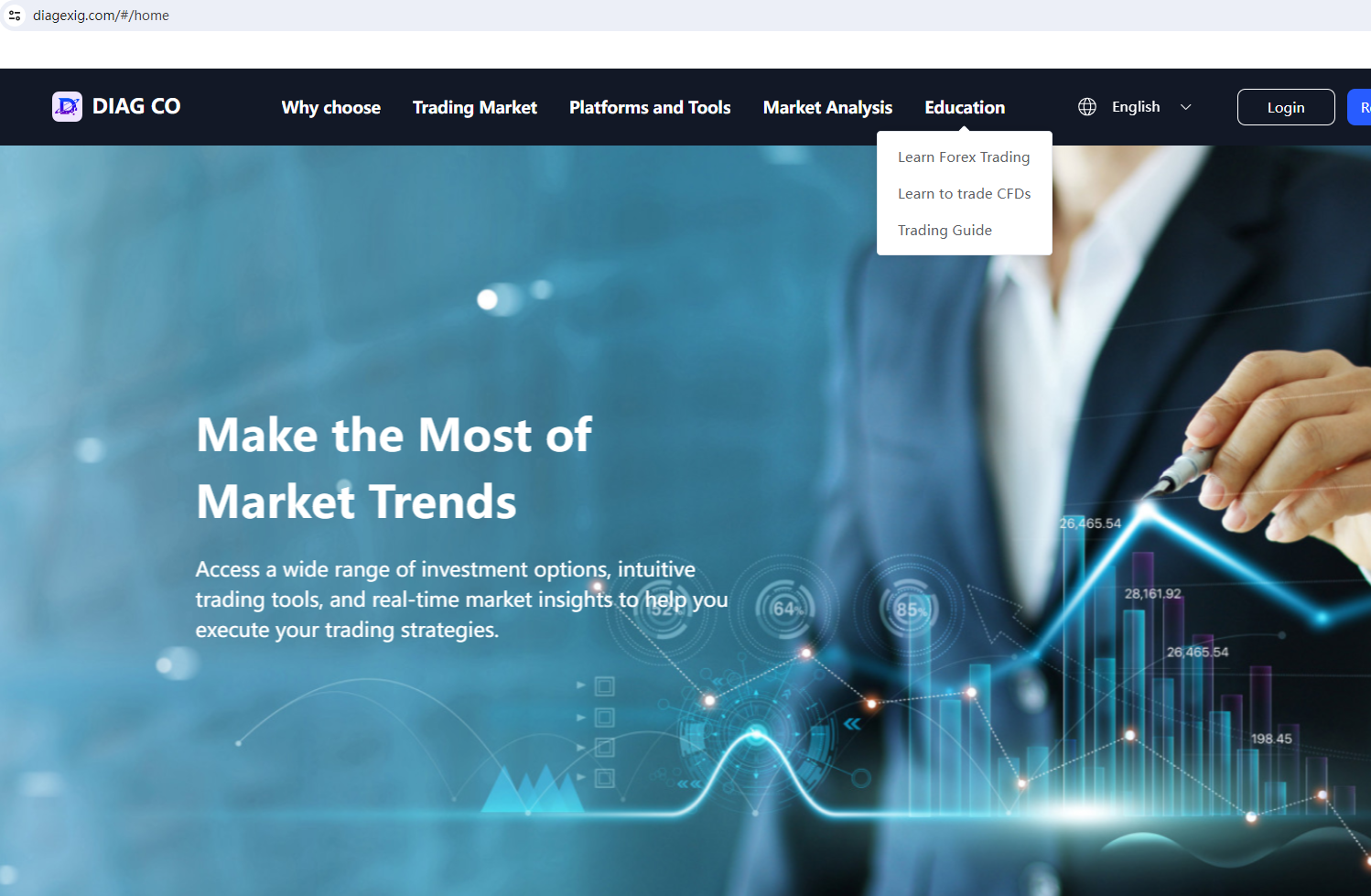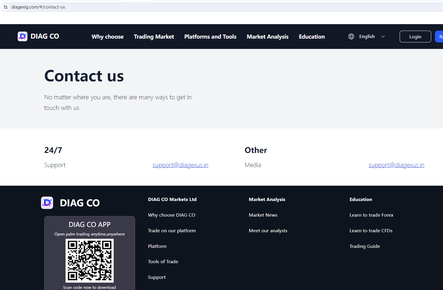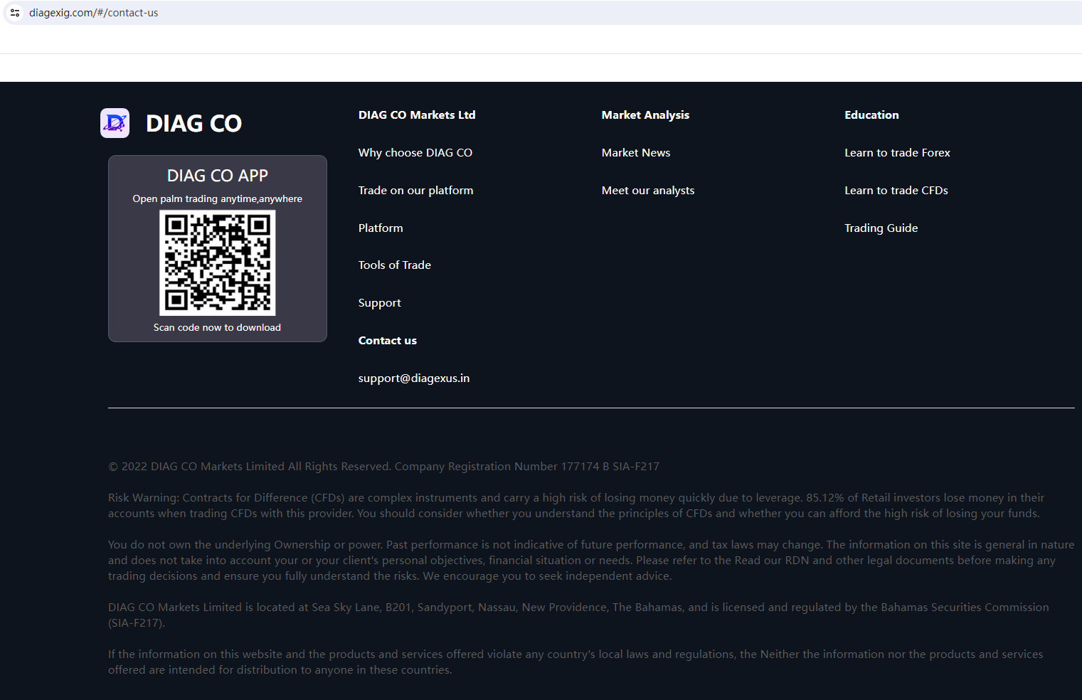 According to its website, it claims regulated by the Bahamas Securities Commission. Upon investigation, we found that the Securities Commission of The Bahamas (SCB) issued a warning against DIAG CO MARKETS LIMITED, which believes this company might be providing financial services or products without authorisation.