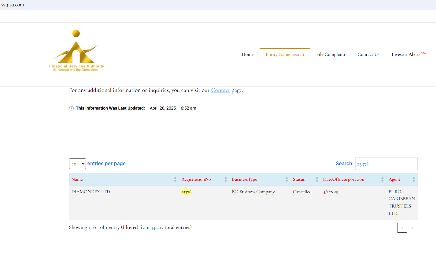 The website of DiamondFX is currently unavailable. The claimed registration with the Financial Services Authority of St. Vincent and The Grenadines (SVG FSA) has been canceled as well. All the signs indicate substantial risks of DiamondFX. Investors should be informed about the development and stay clear of it.