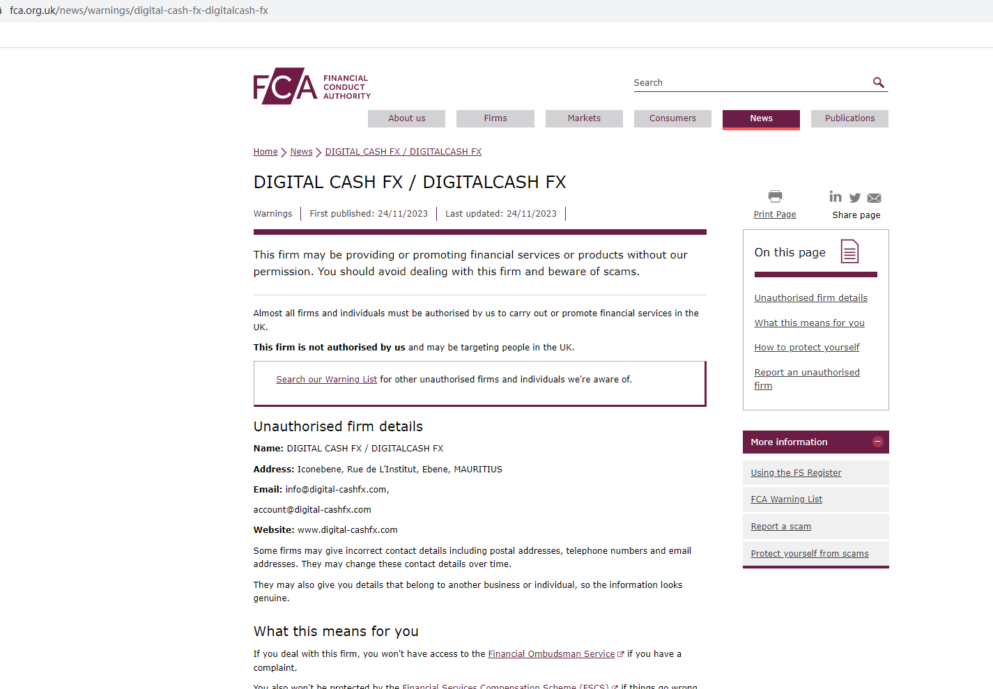 In addition, the United Kingdom Financial Conduct Authority (UK FCA) issued a warning that DIGITAL CASH FX was providing financial services or products in the UK without authorisation.