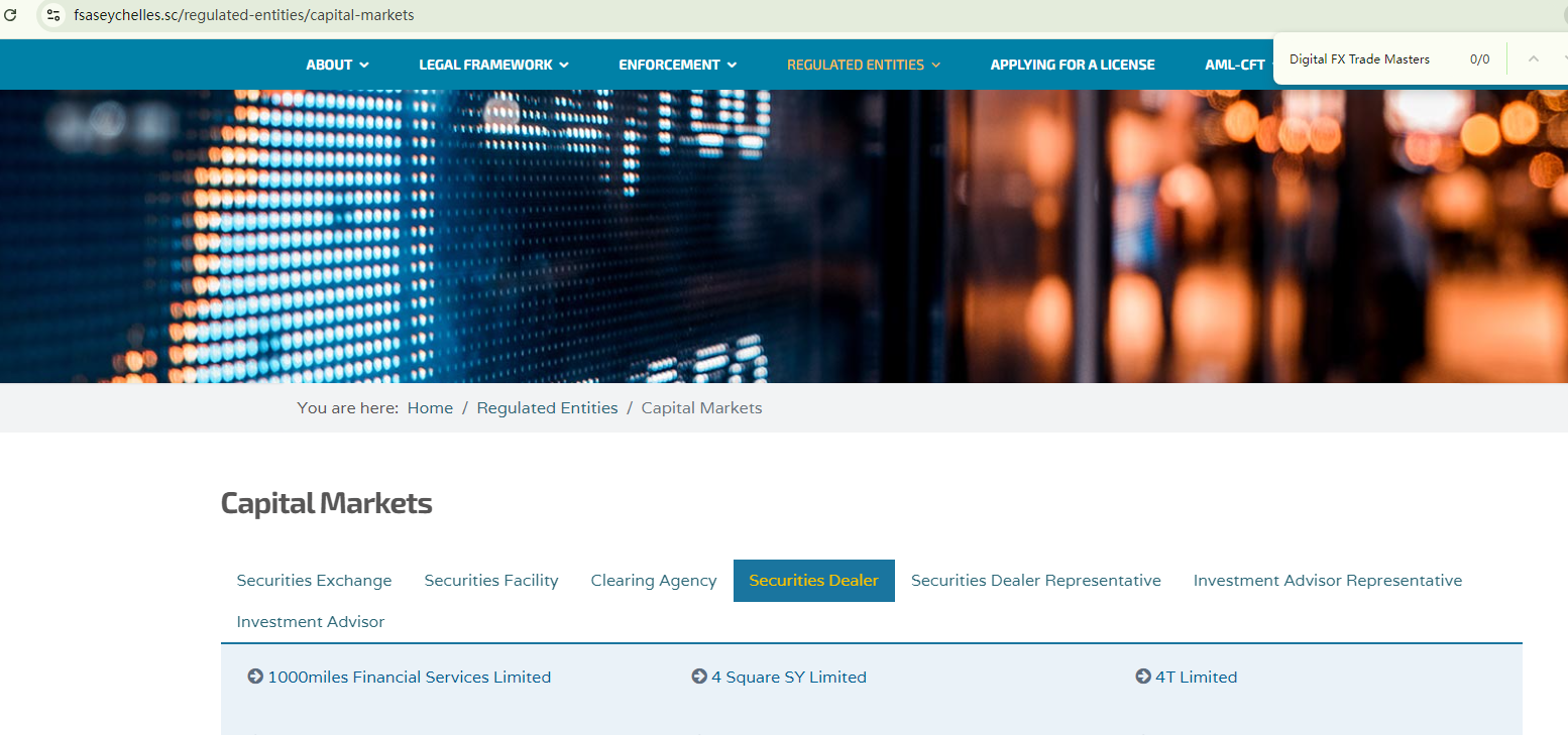 Digital FX Trade Masters claims to be licensed by the Financial Services Authority of Seychelles (FSA Seychelles) and the Financial Services Authority of St. Vincent and the Grenadines (SVG FSA). However, our search for this company in the registers of both authorities hasn't yielded any corresponding records. This means the regulatory claimrs are fake.