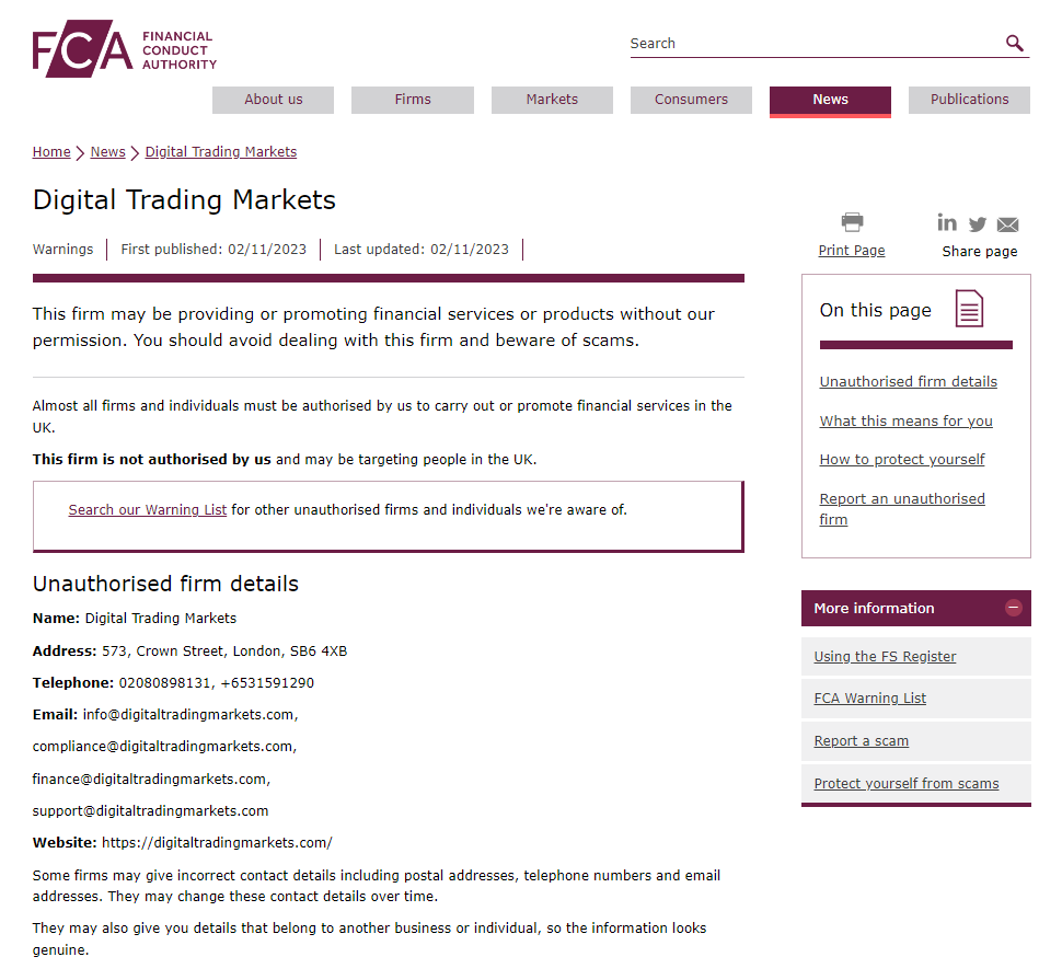 On 2 November 2023, the United Kingdom Financial Conduct Authority (UK FCA) issued a warning that Digital Trading Markets was providing financial services or products in the UK without authorisation. You may visit: https://www.fca.org.uk/news/warnings/digital-trading-markets