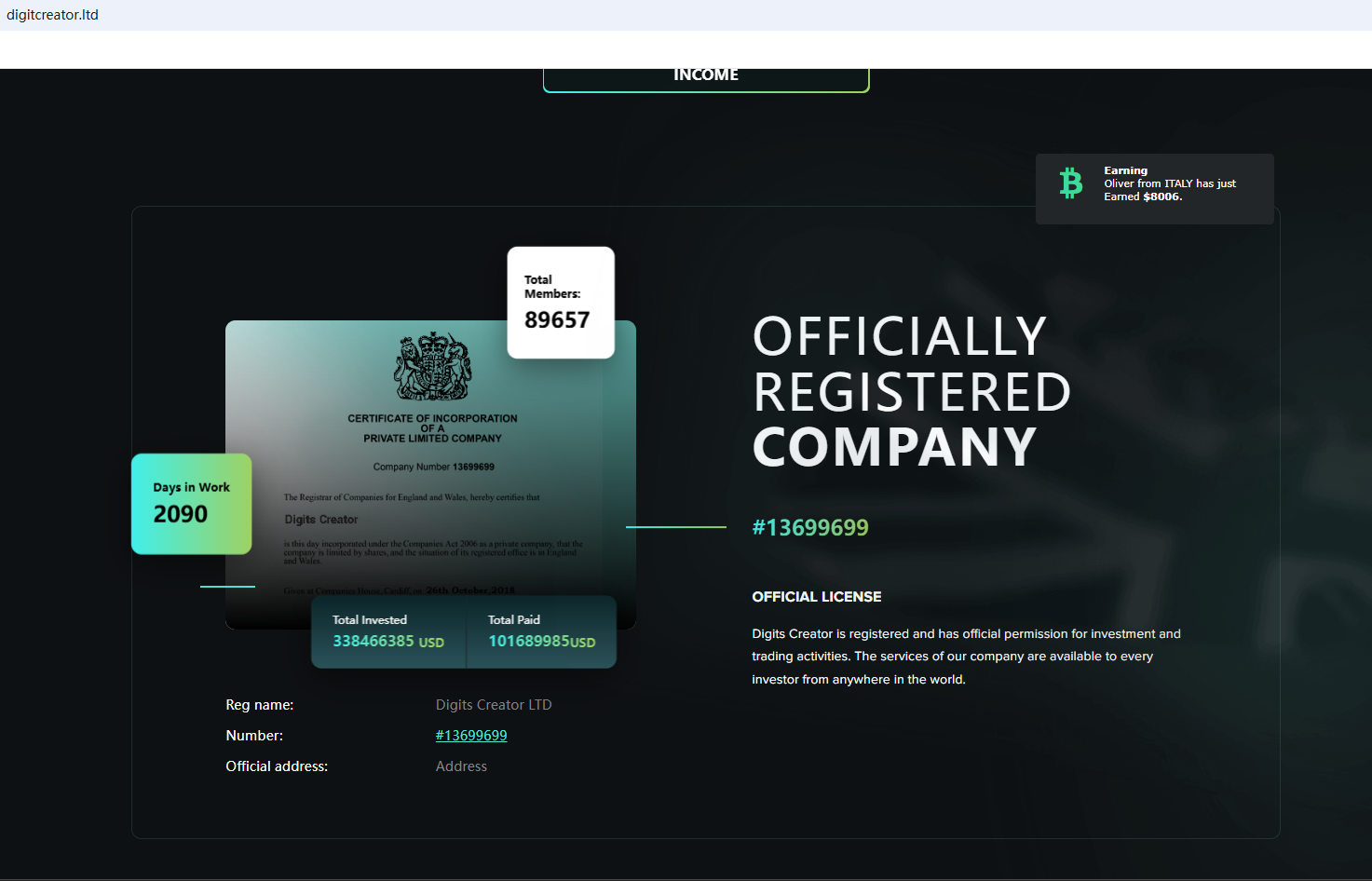 The website uses a common template for scammers and has been flagged by Brokersview many times before, for example: Option Bull Market. It displays a certificate from Companies House (CH) on the website, but as we all know, CH does not have the authority to regulate foreign exchange. The funny thing is that the Financial Conduct Authority (FCA) issued a warning against Digits creator for the lack of the required authorization.
