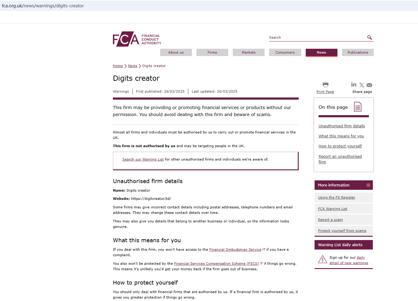 On March 25, 2025, the Financial Conduct Authority (FCA) issued a warning against Digits creator for the lack of the required authorization. https://www.fca.org.uk/news/warnings/digits-creator