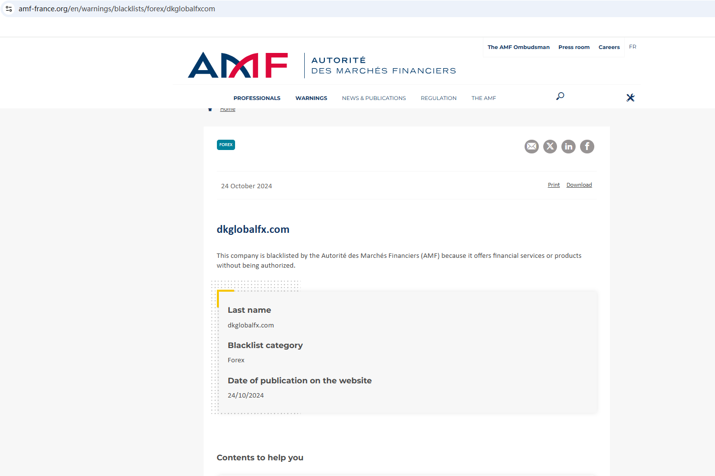 On October 24, 2024, the Financial Authority (Autorité des Marchés Financiers, AMF) added DK Global Forex Limited to warning list for it being an unauthorized company engaging in forex activities. https://www.amf-france.org/en/warnings/blacklists/forex/dkglobalfxcom