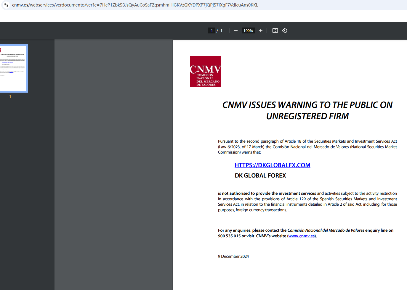 On December 9, 2024, the Comisión Nacional del Mercado de Valores (CNMV) has added DK Global Forex Limited to its warning list for providing investment services without authorization. https://www.cnmv.es/webservices/verdocumento/ver?e=7HcP1Zbk5BJsQyAuCoSaFZqsmhmHlGKVzGKYDPXP7jQPj57IXgF7VdIcuAns0KKL