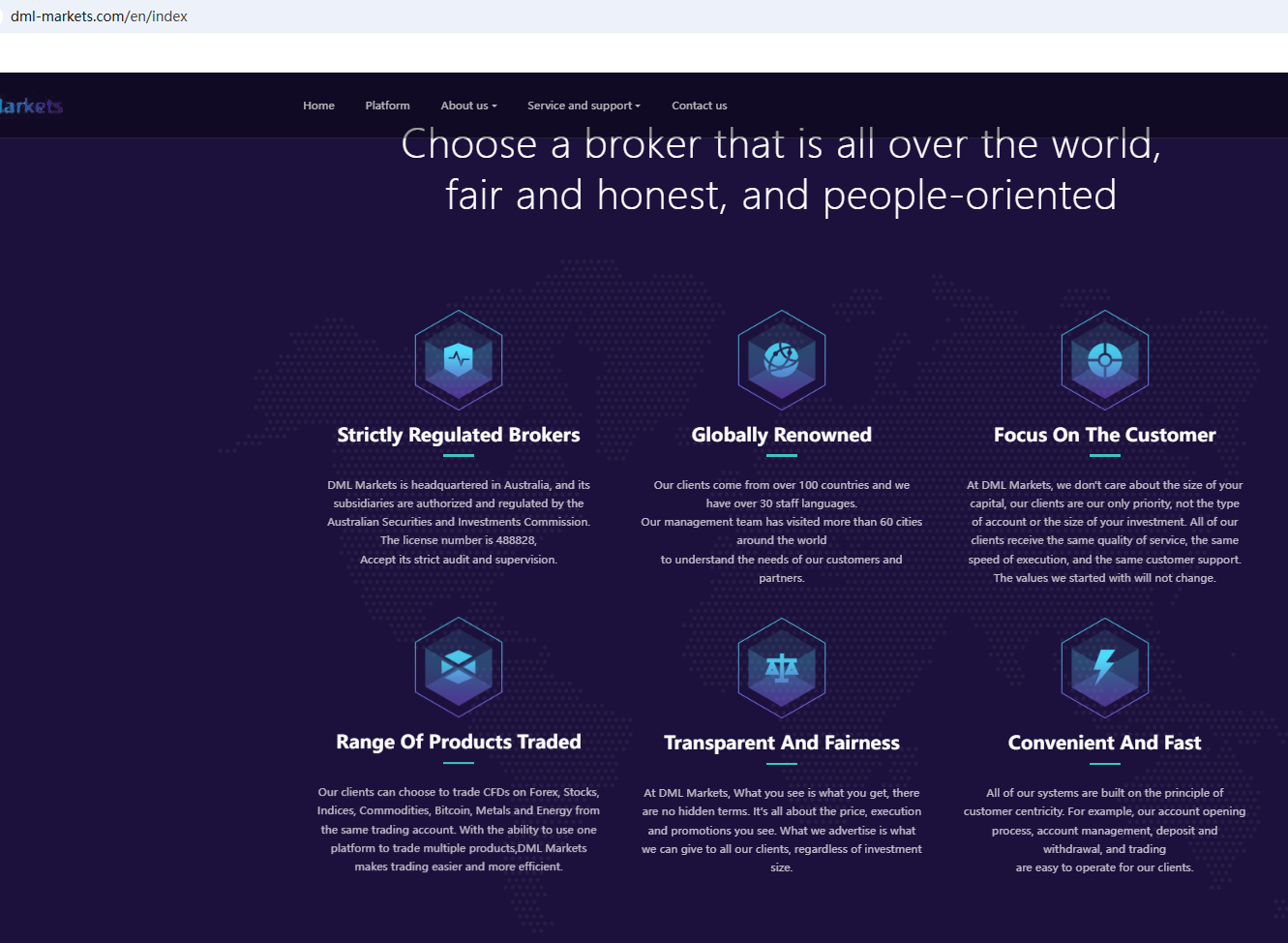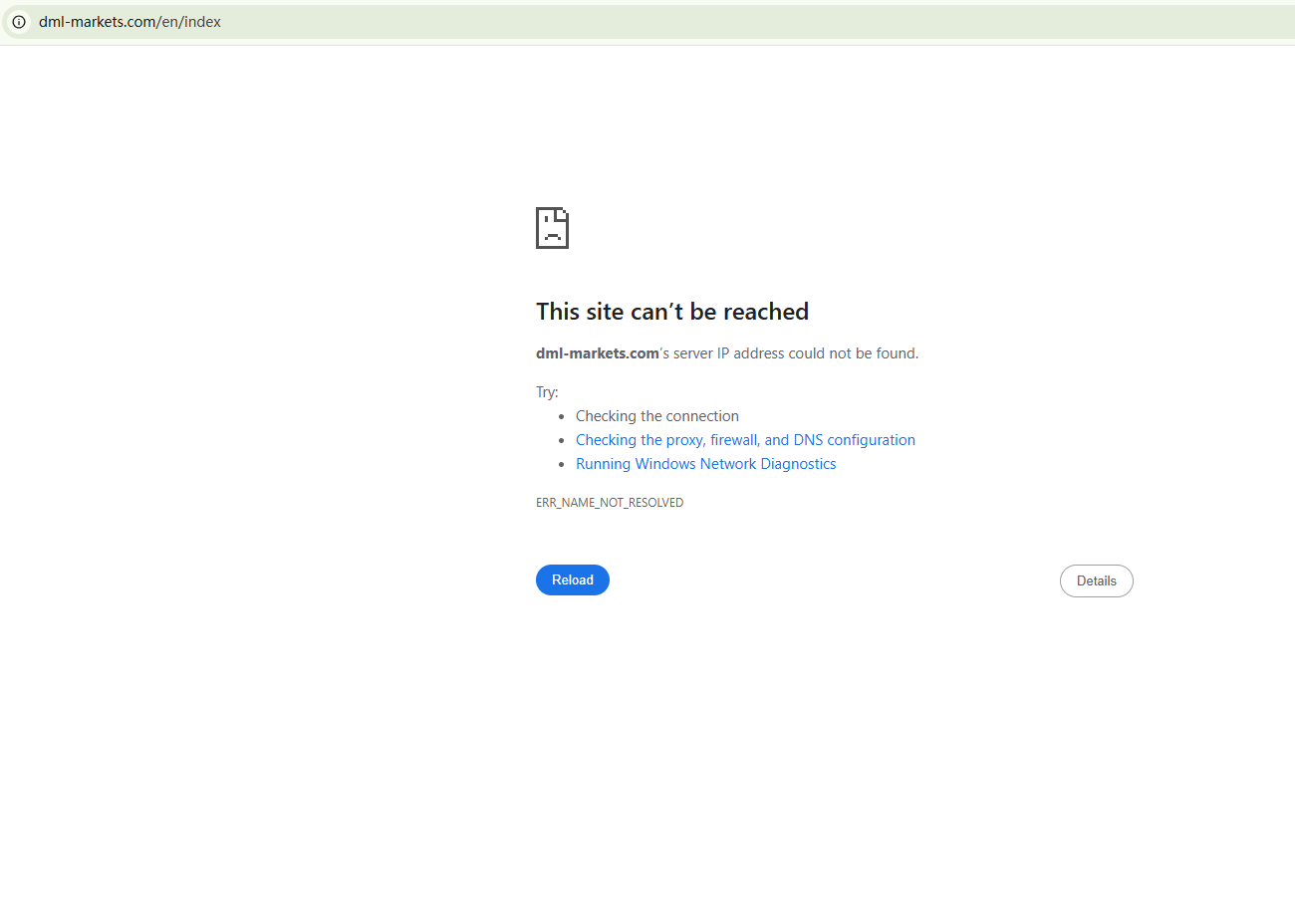 BrokersView found that the domain "https://dml-markets.com/en/index" is currently inaccessible. This is widely regarded as a significant red flag, as the suspension of a broker's website often points to underlying regulatory or operational issues.