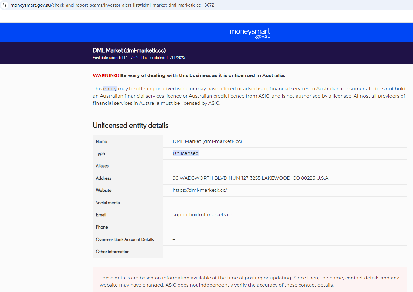 On Nov 11, 2025, the Australian Securities & Investments Commission (ASIC) issued a warning against DML Market, believing this company might be providing financial services or products without proper authorization. https://moneysmart.gov.au/check-and-report-scams/investor-alert-list#!dml-market-dml-marketk-cc--3672