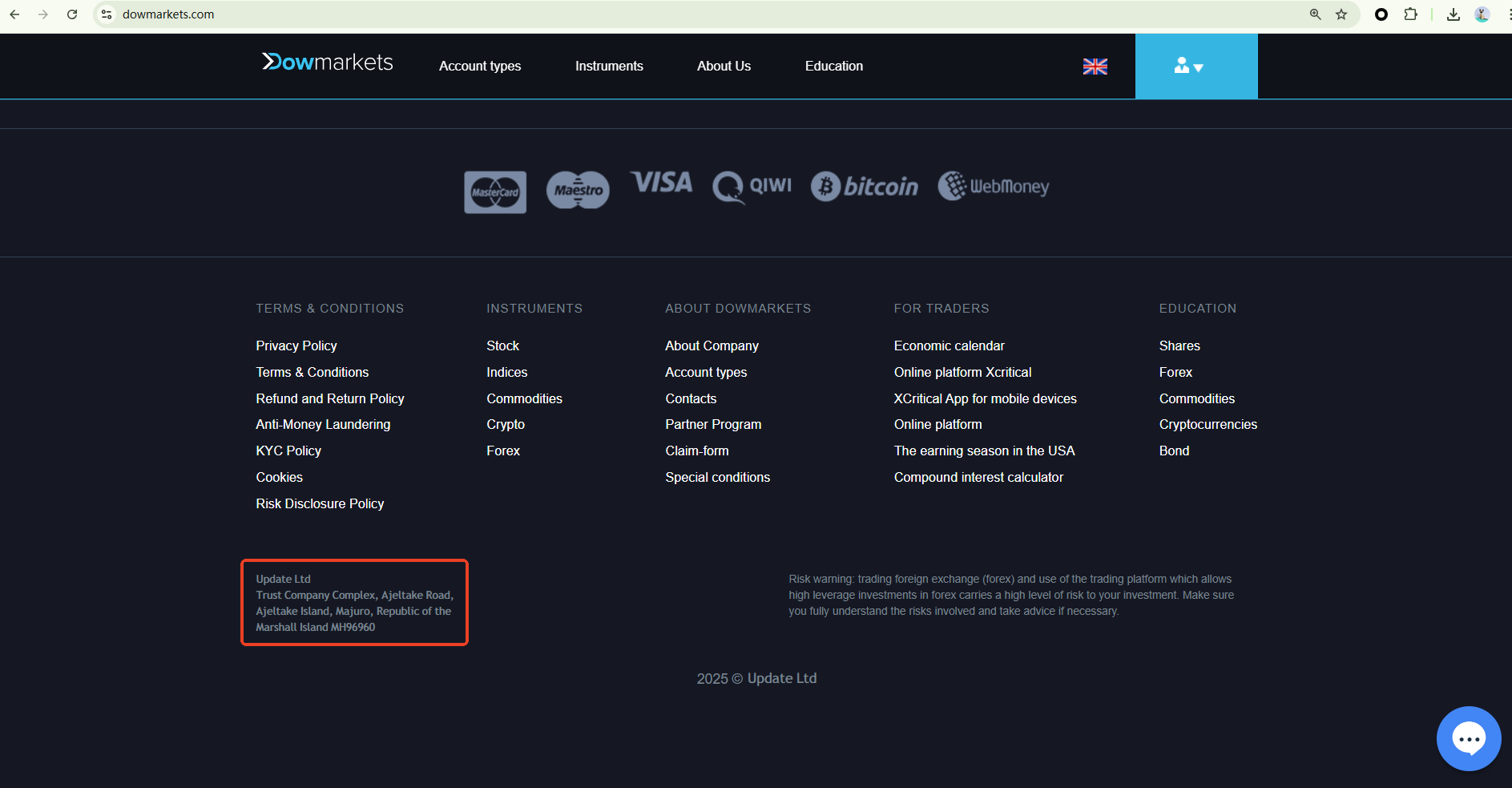 Dowmarkets does not disclose any regulatory information on its website and only claims to operate under Update Ltd, registered in the Republic of the Marshall Islands. While the company’s registration with the Marshall Islands Registry (IRI) has been verified, the IRI is not a government body or financial regulator and does not license or supervise forex activities, meaning such registration does not authorize financial services. We have found no evidence of regulation by any recognized authority, leaving investors with no protection, transparency, or recourse. Trading with Dowmarkets carries substantial risk, and the broker should be considered a potential scam.