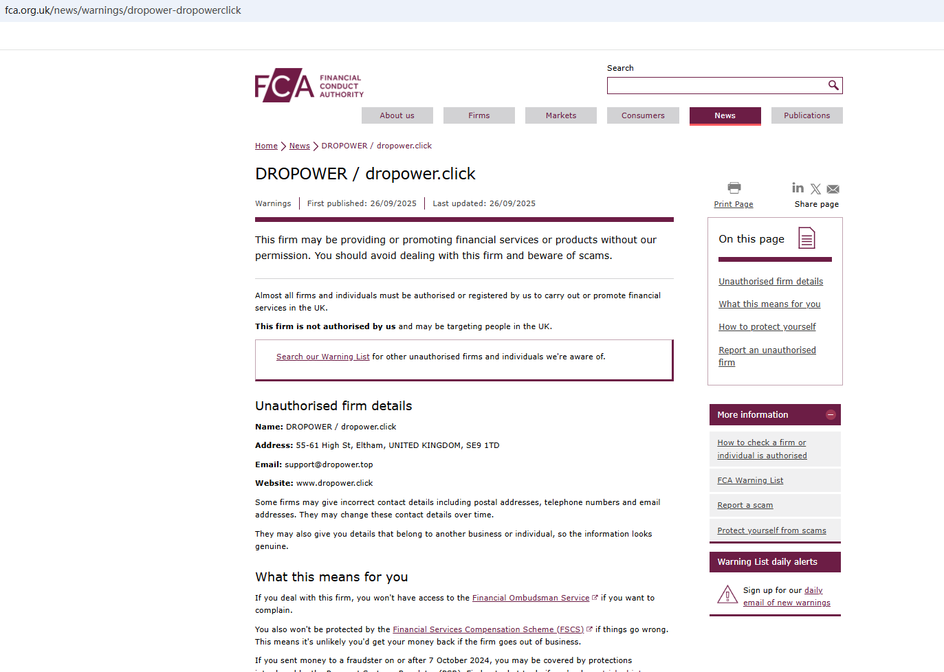 On September 26, 2025, the Financial Conduct Authority (FCA) issued a warning regarding DROPOWER.CLICK, suspecting that this company may be offering financial services or products without the necessary authorization. https://www.fca.org.uk/news/warnings/dropower-dropowerclick