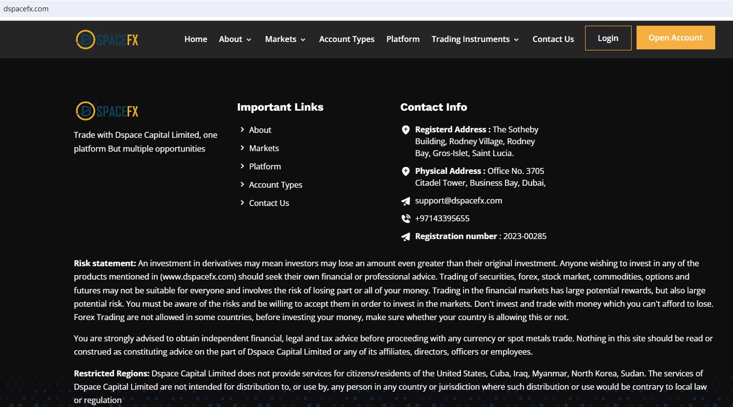 DSPACEFX (DSPACE CAPITAL LIMITED) claims to be a brokerage firm registered in Saint Lucia (License number 2023-00285), together with offices in Dubai, offering wide range of financial services to traders, including Forex, Metals, Indices, Energies, Commodities, Cryptos and more instruments in global markets.