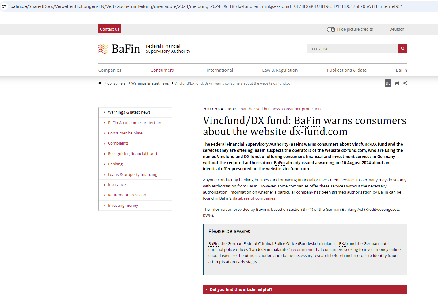 On September 20 2024, the Federal Financial Supervisory Authority (BaFin) warned consumers about the services offered by the company DX fund (dx-fund.com), which is offering financial and investment services without the required authorization. https://www.bafin.de/SharedDocs/Veroeffentlichungen/EN/Verbrauchermitteilung/unerlaubte/2024/meldung_2024_09_18_dx-fund_en.html