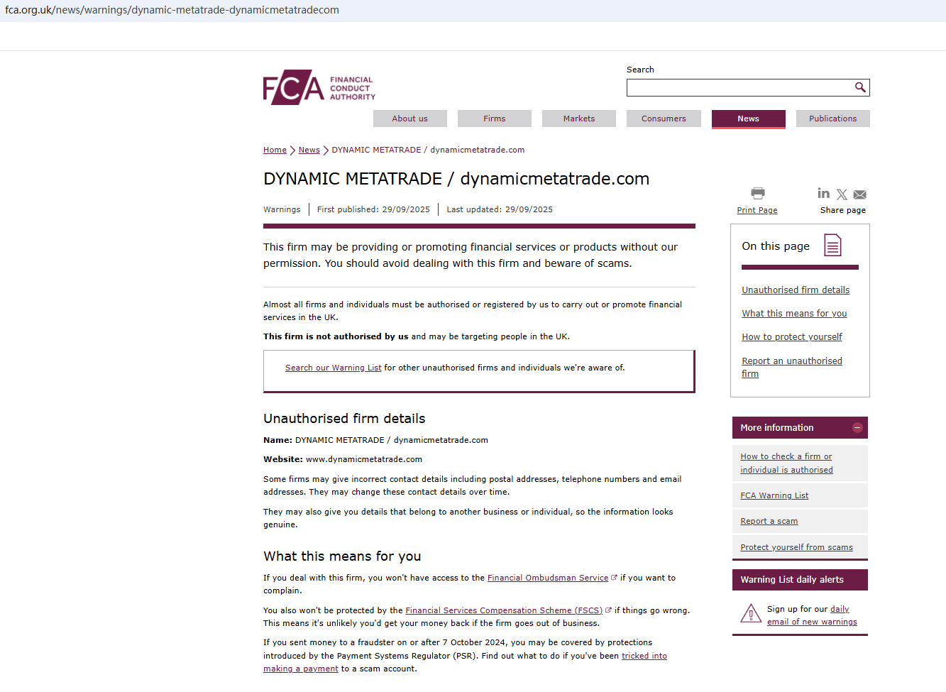 On September 26, 2025, the Financial Conduct Authority (FCA) issued a warning regarding DYNAMIC METATRADE, suspecting that this company may be offering financial services or products without the necessary authorization. https://www.fca.org.uk/news/warnings/dynamic-metatrade-dynamicmetatradecom