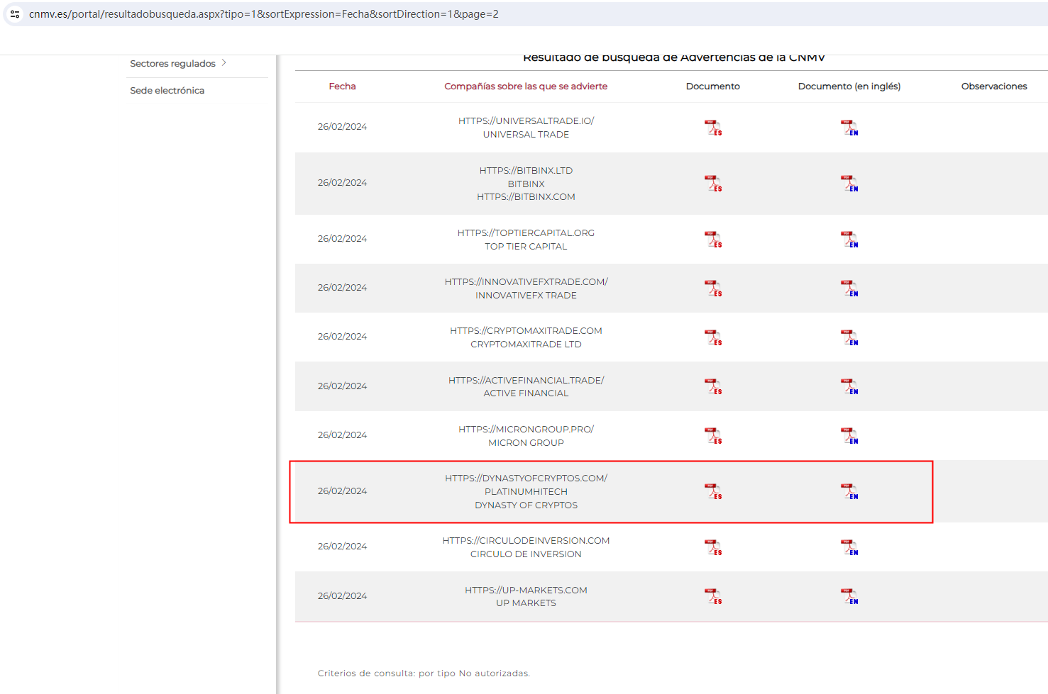 On February 26, 2024, the Comisión Nacional del Mercado de Valores (CNMV) added DYNASTY OF CRYPTOS to its warning list for providing investment services without authorization. https://www.cnmv.es/portal/resultadobusqueda.aspx?tipo=1&sortExpression=Fecha&sortDirection=1&page=2