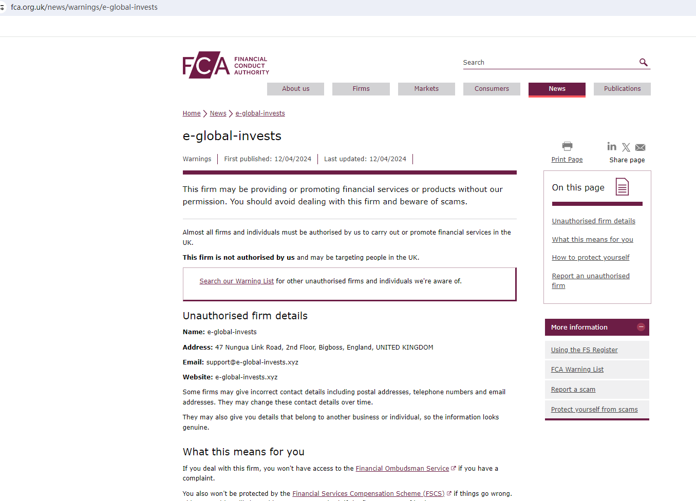 On 12 Apr 2024, the United Kingdom Financial Conduct Authority (UK FCA) issued a warning that e global invests was providing financial services or products in the UK without authorisation. You may visit: https://www.fca.org.uk/news/warnings/e-global-invests
